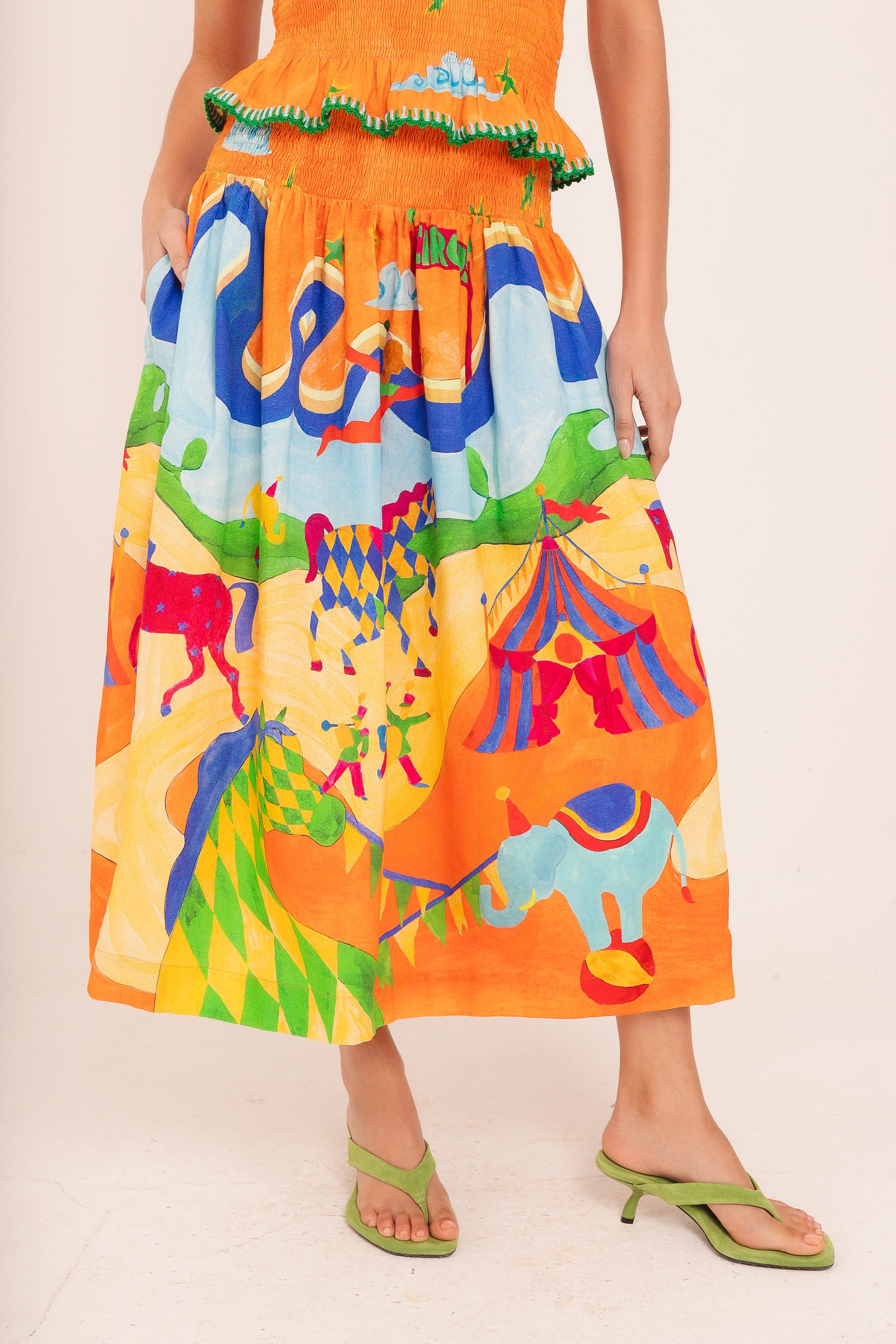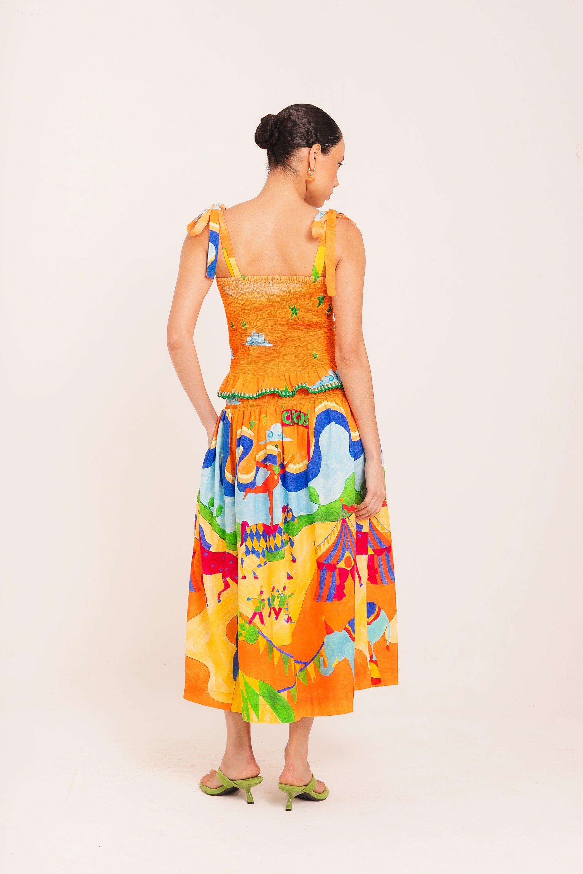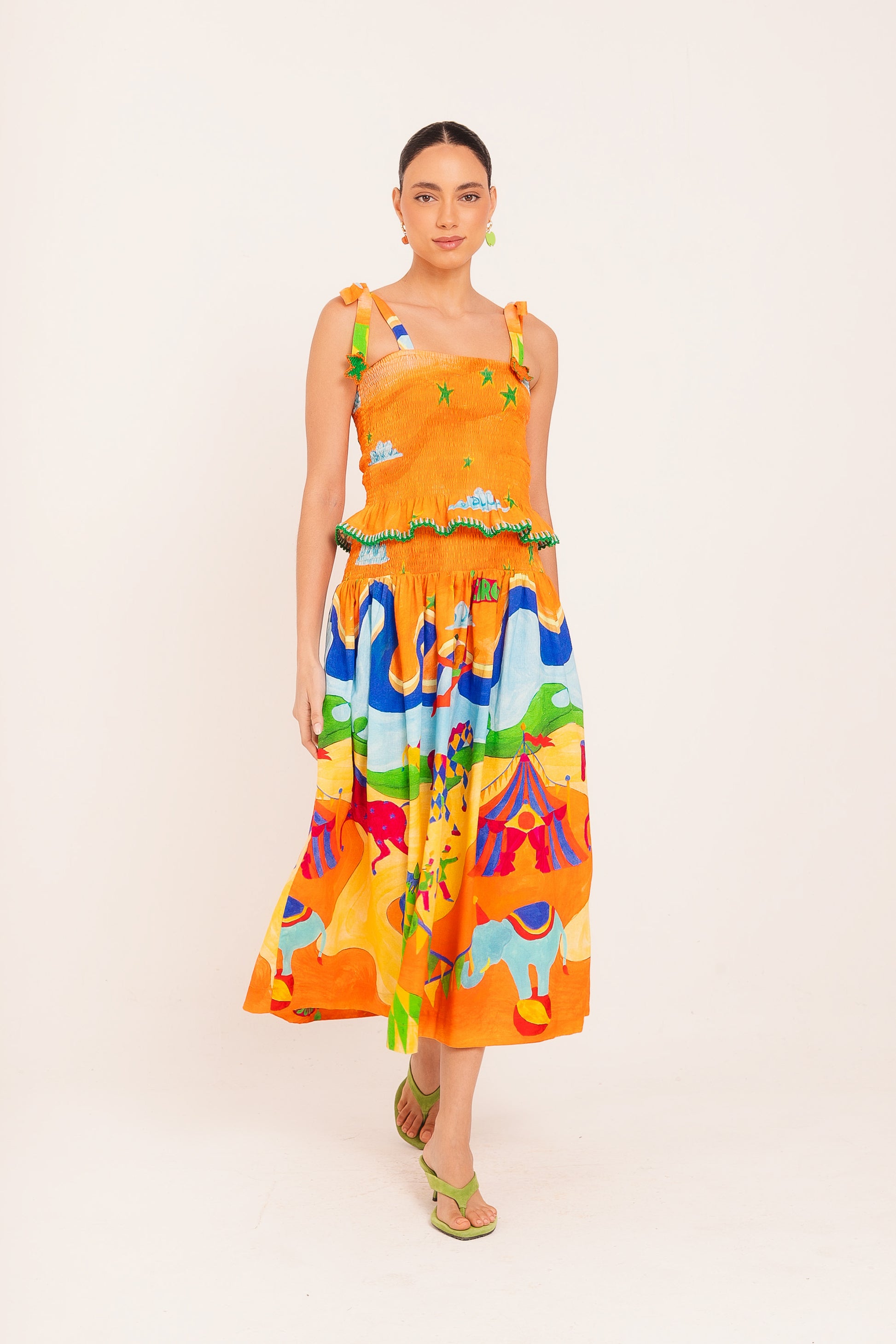 A estampa Circo foi desenvolvida a partir de uma pintura à mão em aquarela, portanto, pode apresentrar variações em sua localização, tornando cada peça única – um charme a mais que reforça o caráter artesanal da Mabô.