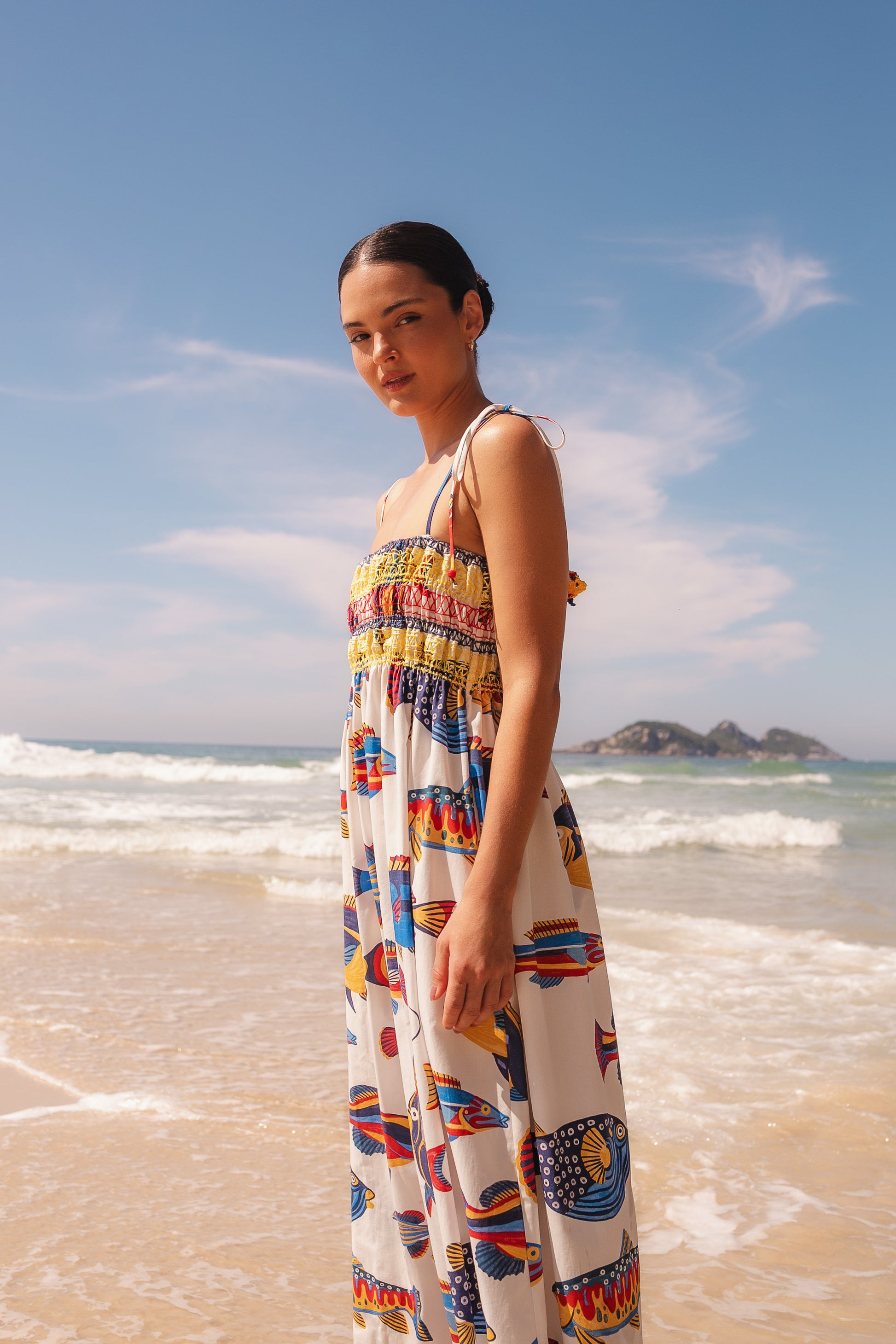 Leve e confortável, o Vestido Paraty traz busto com bordado e alças finas reguláveis com amarração. O lastex garante o ajuste perfeito, enquanto a modelagem solta oferece fluidez ao movimento. Para finalizar, as ponteiras das alças recebem dois peixinhos, trazendo um toque lúdico e especial.