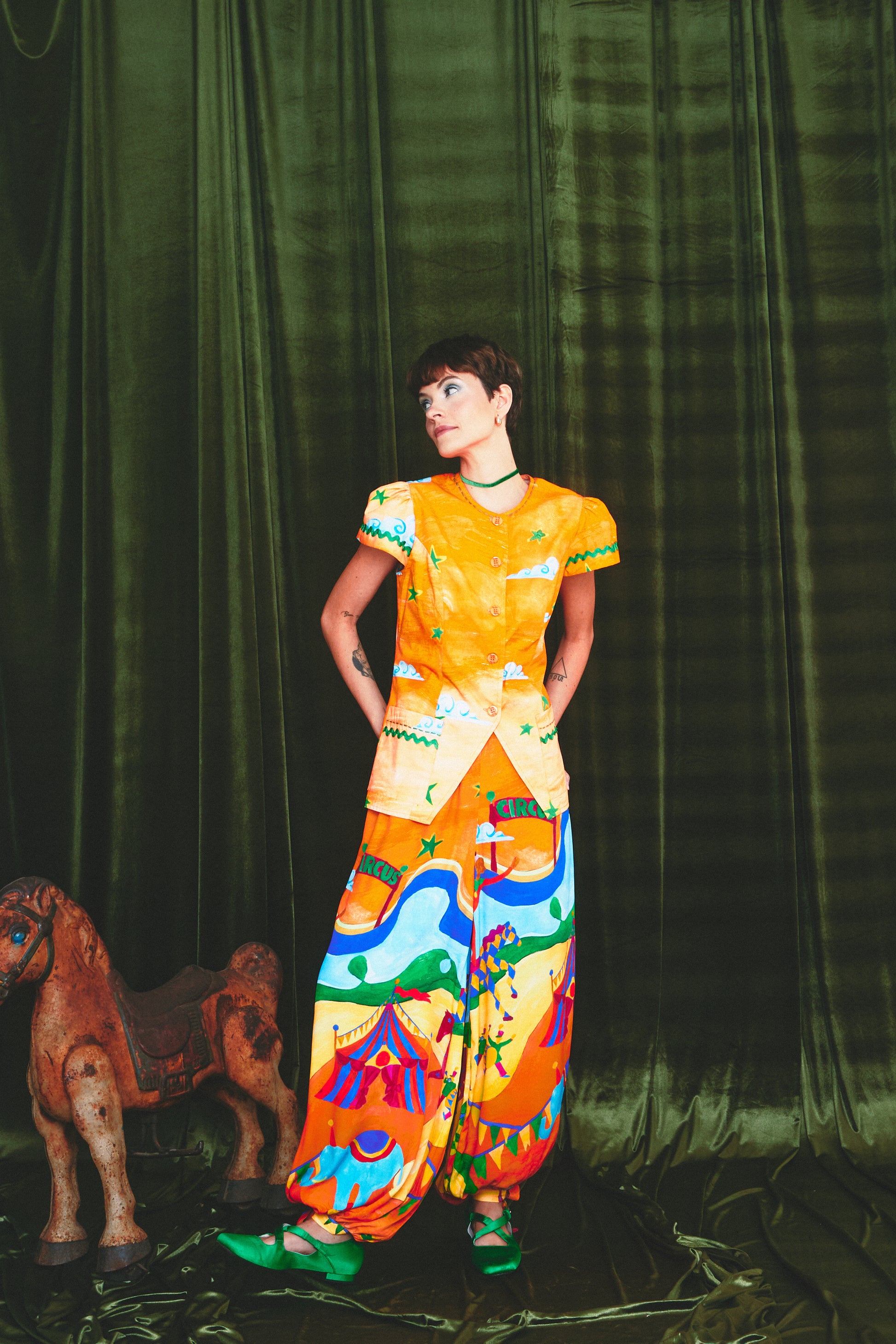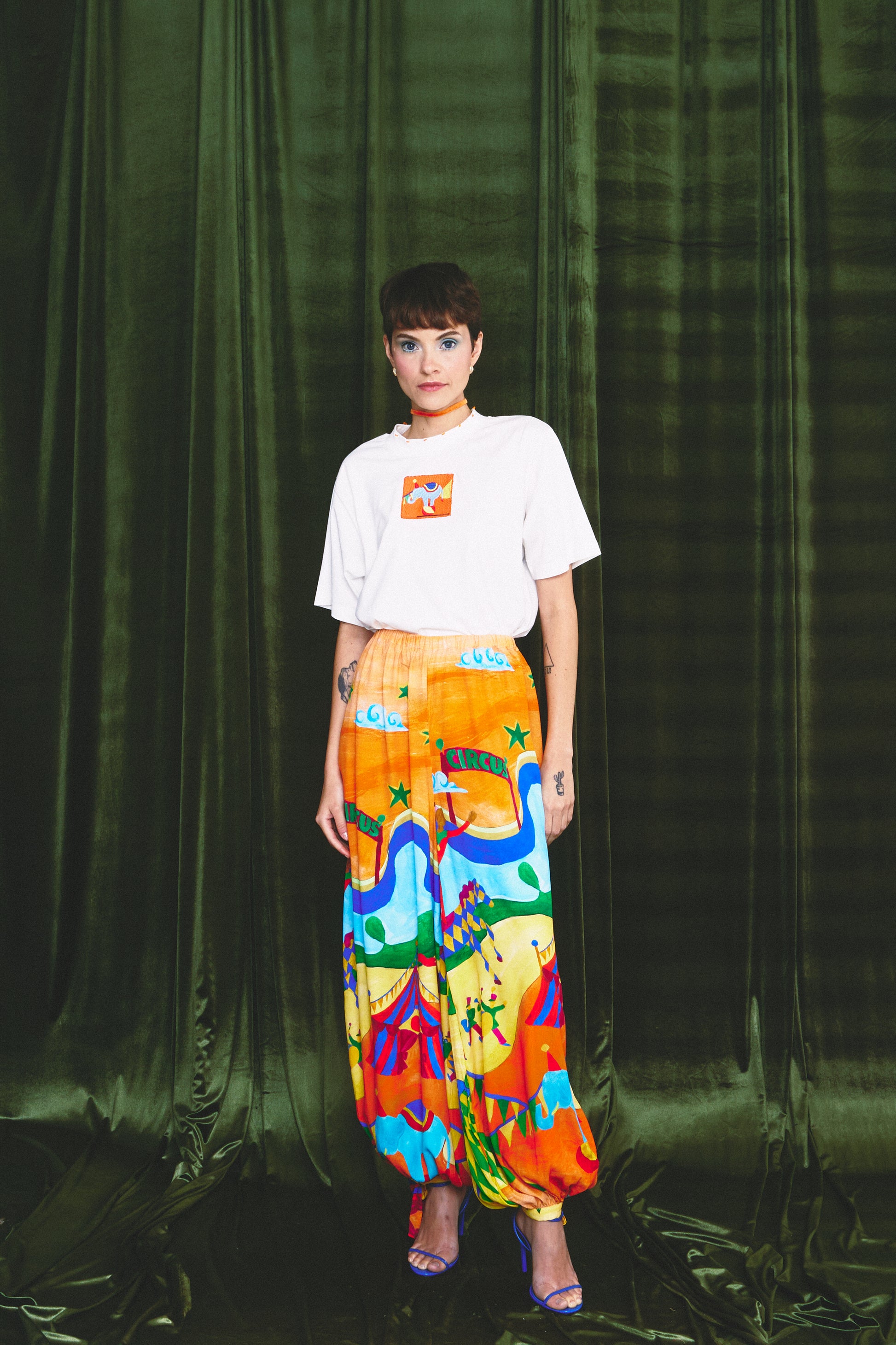 A estampa Circo foi desenvolvida a partir de uma pintura à mão em aquarela, portanto, pode apresentar variações na sua localização, tornando cada peça única — um charme a mais que reforça o caráter artesanal da Mabô.