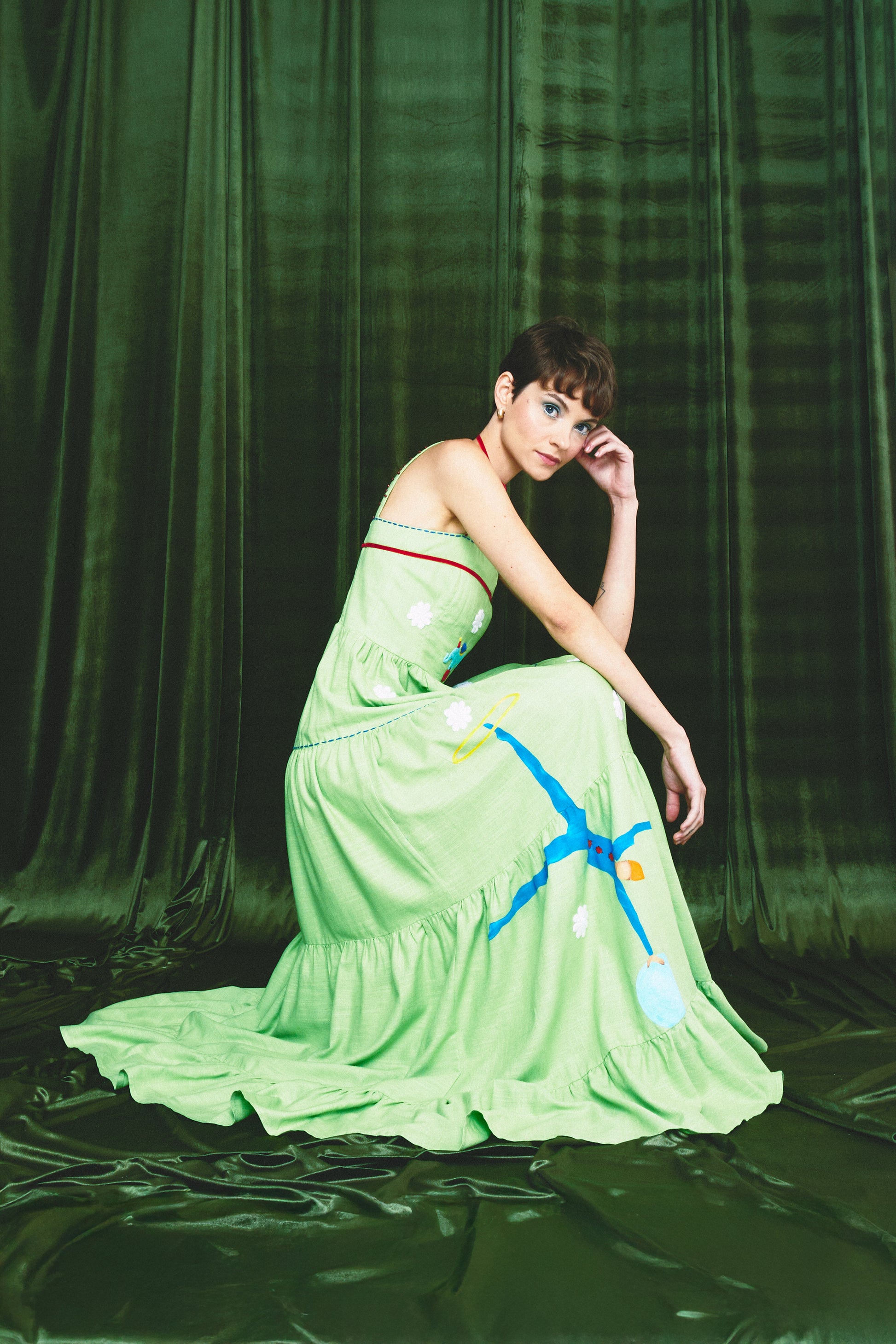 Modelagem clássica e queridinha da Mabô, o novo Amanda encanta pelos detalhes feitos à mão. A peça traz a pintura de um malabarista, bordados à mão delicados de flores ao longo do vestido e um elefante malabarista bordado no busto. As alças recebem acabamento com miçangas e aplicação de fita de veludo, tornando o vestido uma verdadeira obra de arte.