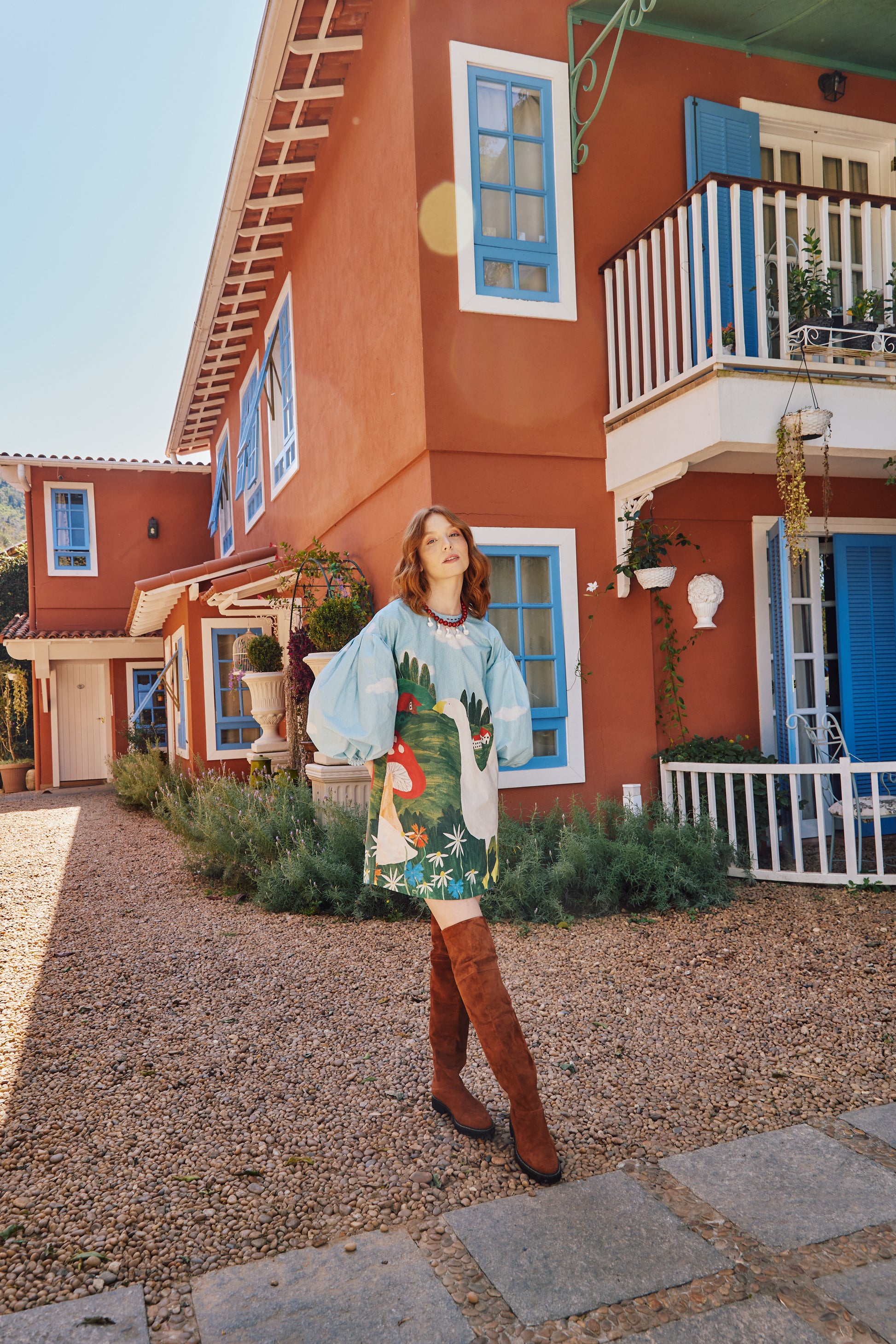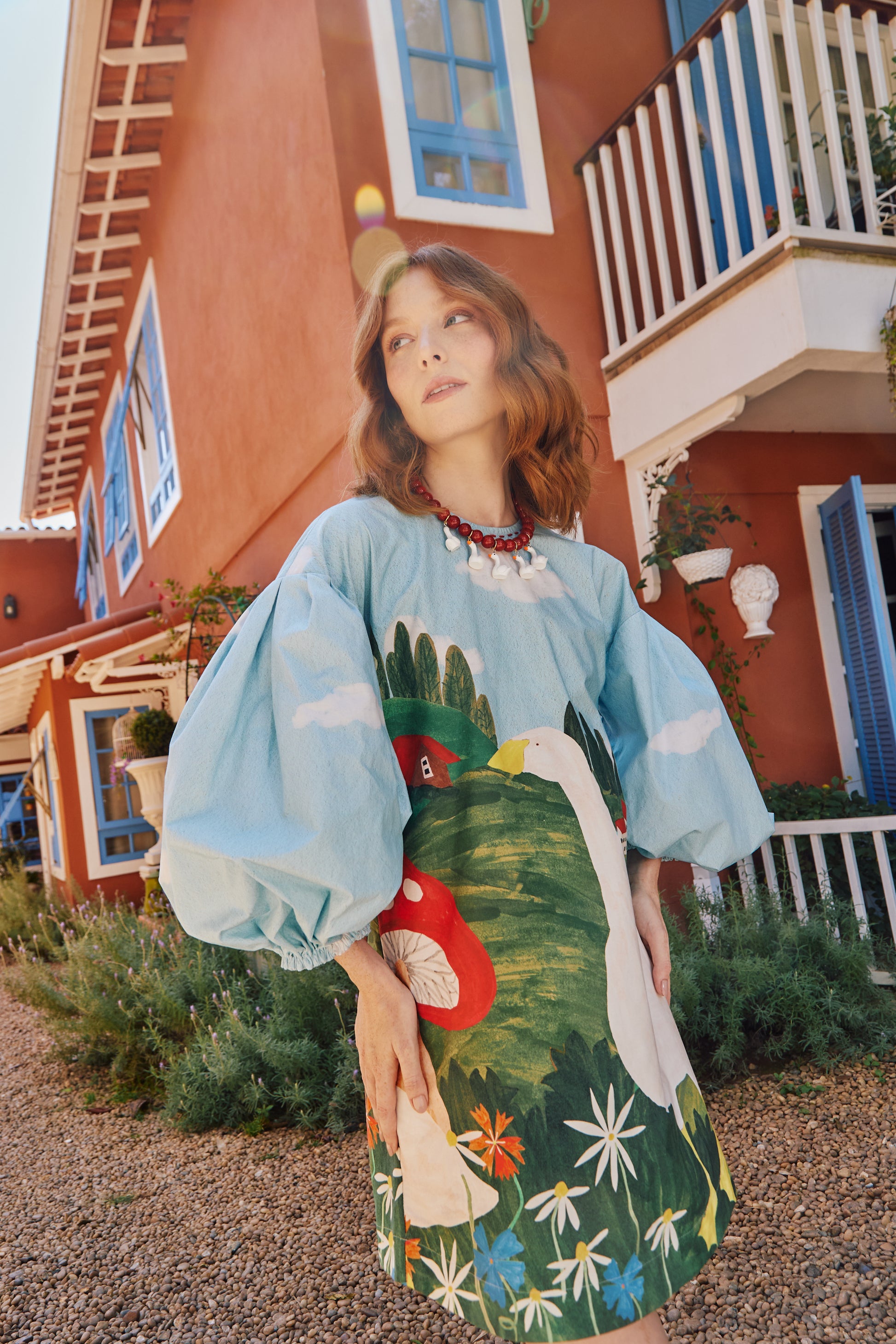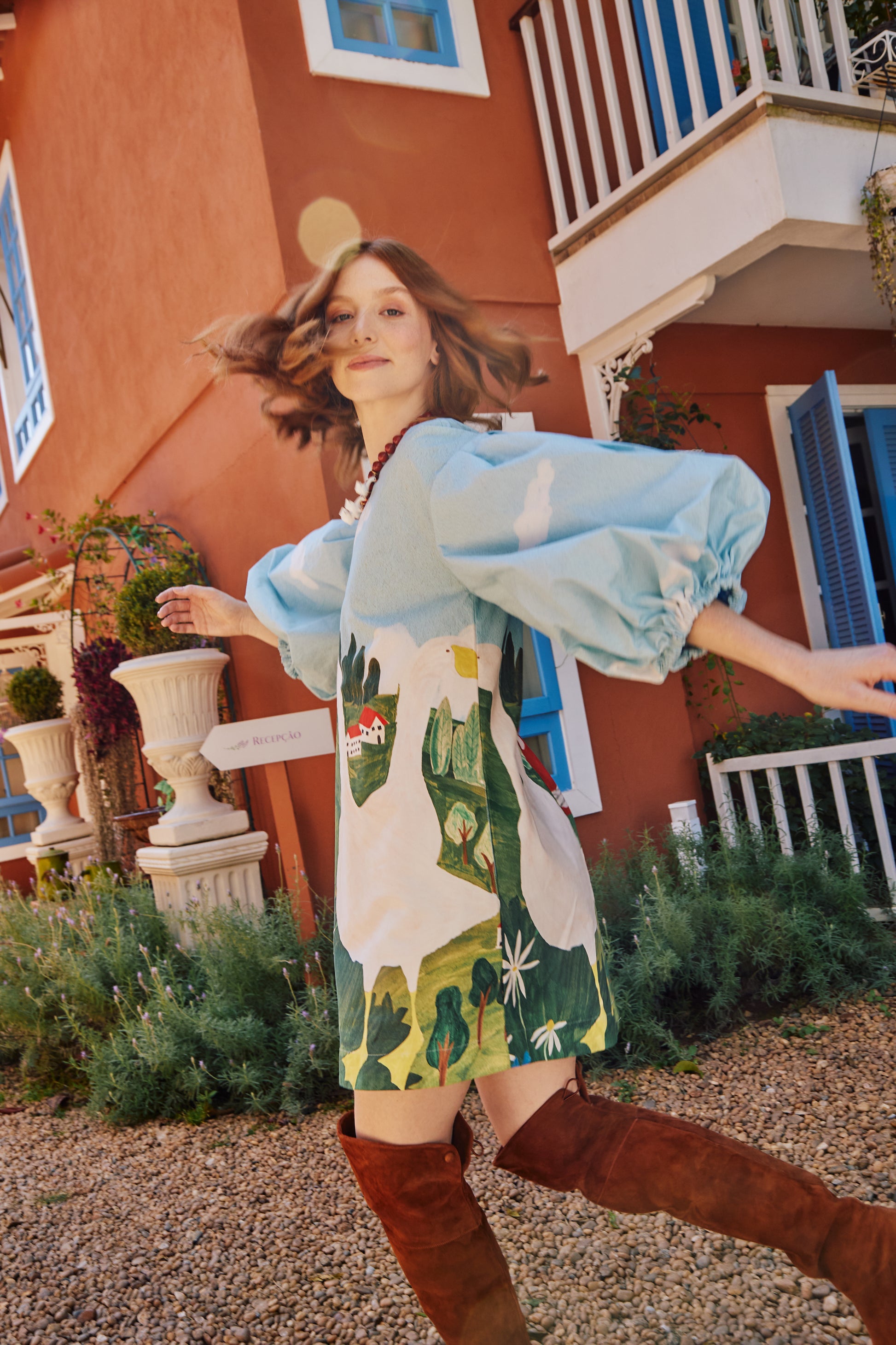 Com estampa exclusiva, o Vestido Fada Fazendinha é puro encanto e versatilidade. Moderno, pode ser usado sozinho como um vestido curtinho ou combinado com calça para composições ainda mais estilosas. Suas mangas bufantes com forro trazem volume e sofisticação, enquanto o shape em A garante leveza e movimento. O decote recebe bordados feitos à mão e, para completar, o vestido possui bolsos laterais, tornam a peça ainda mais prática.