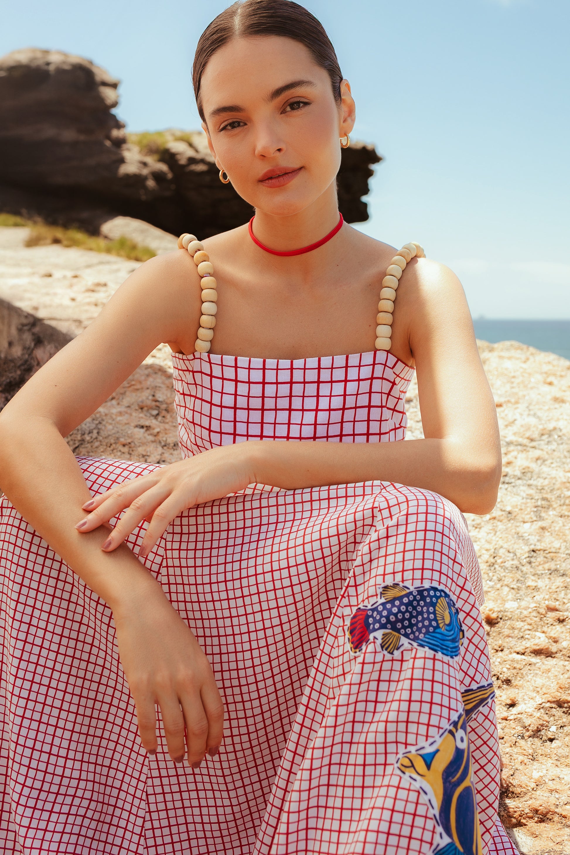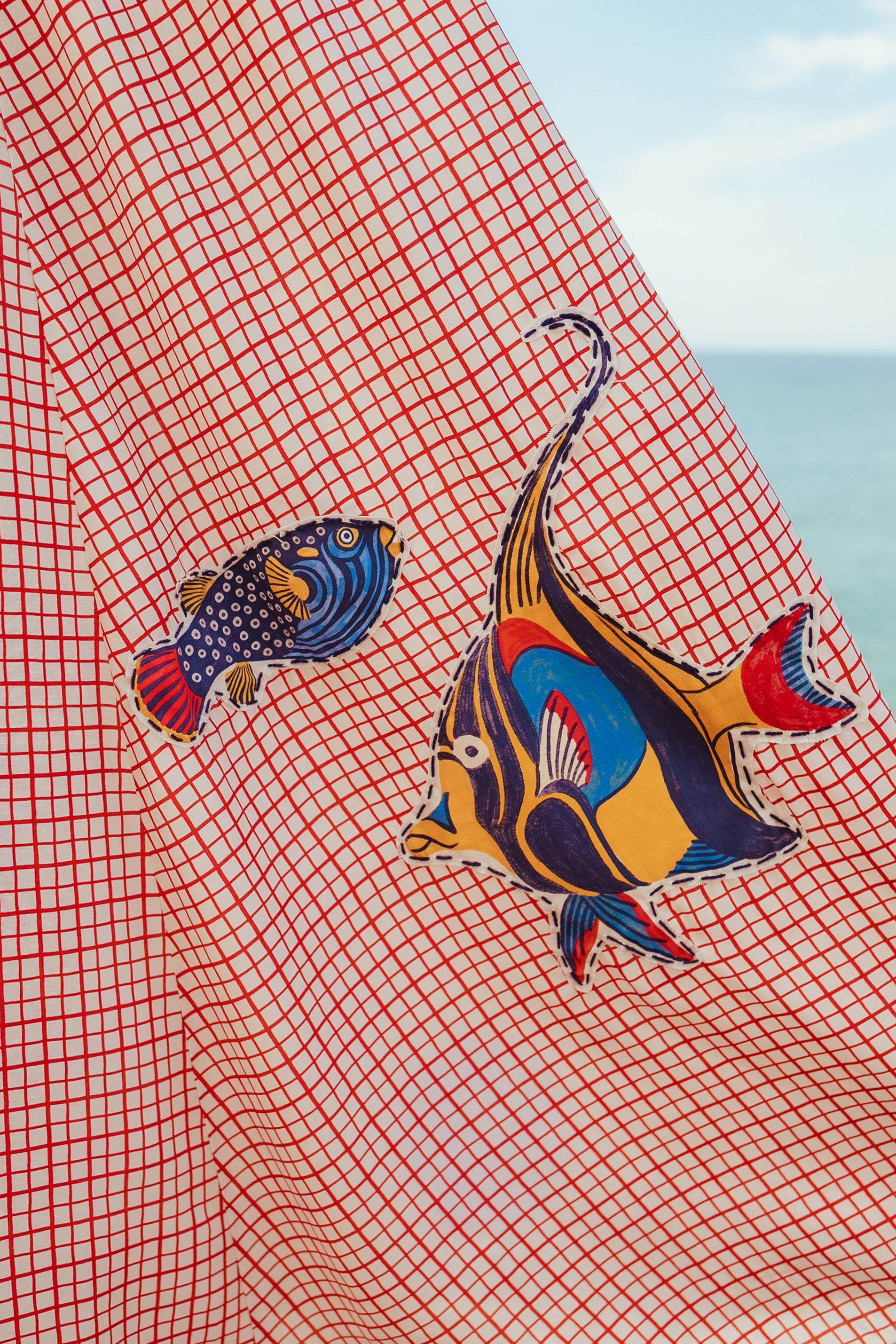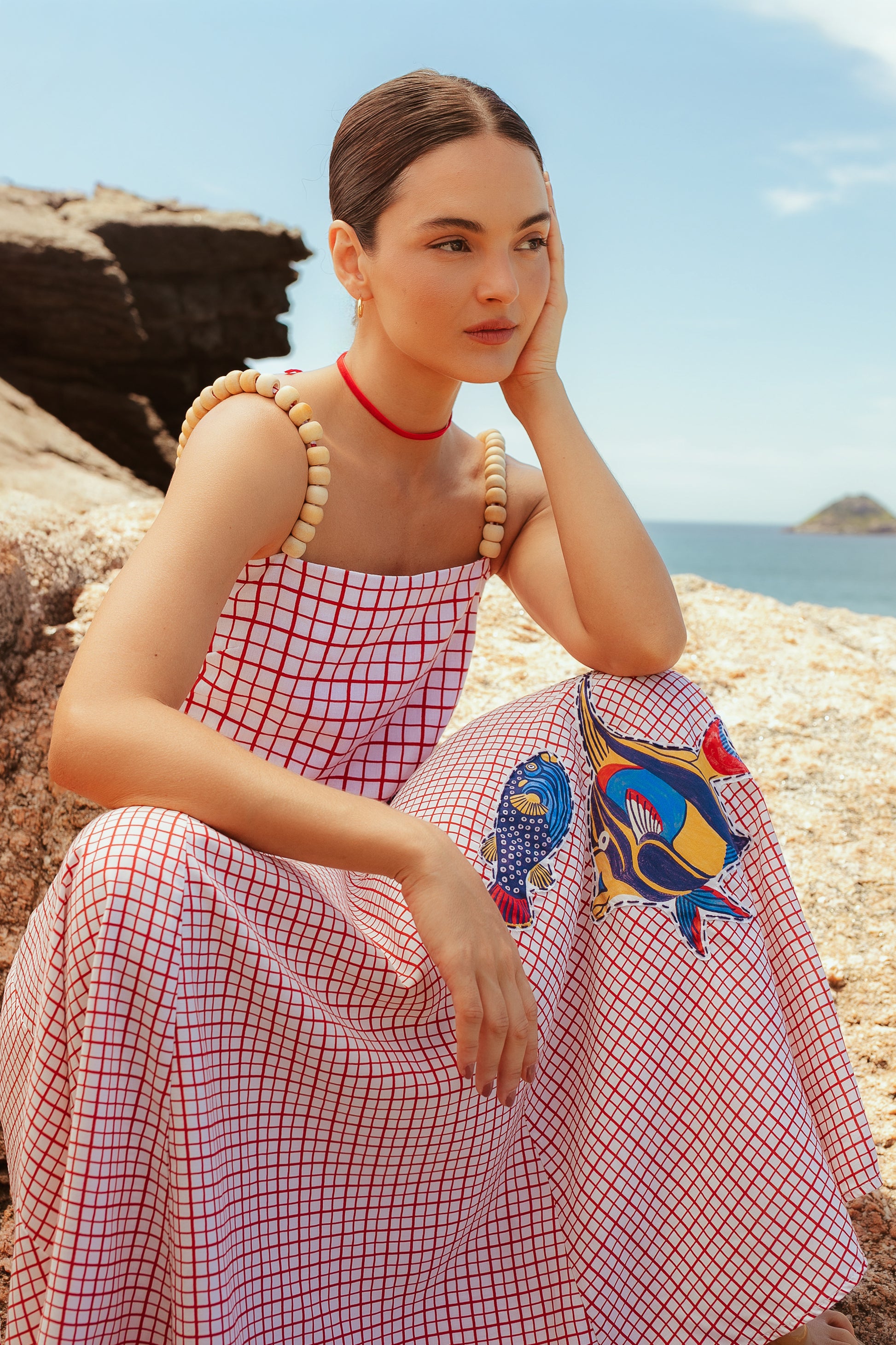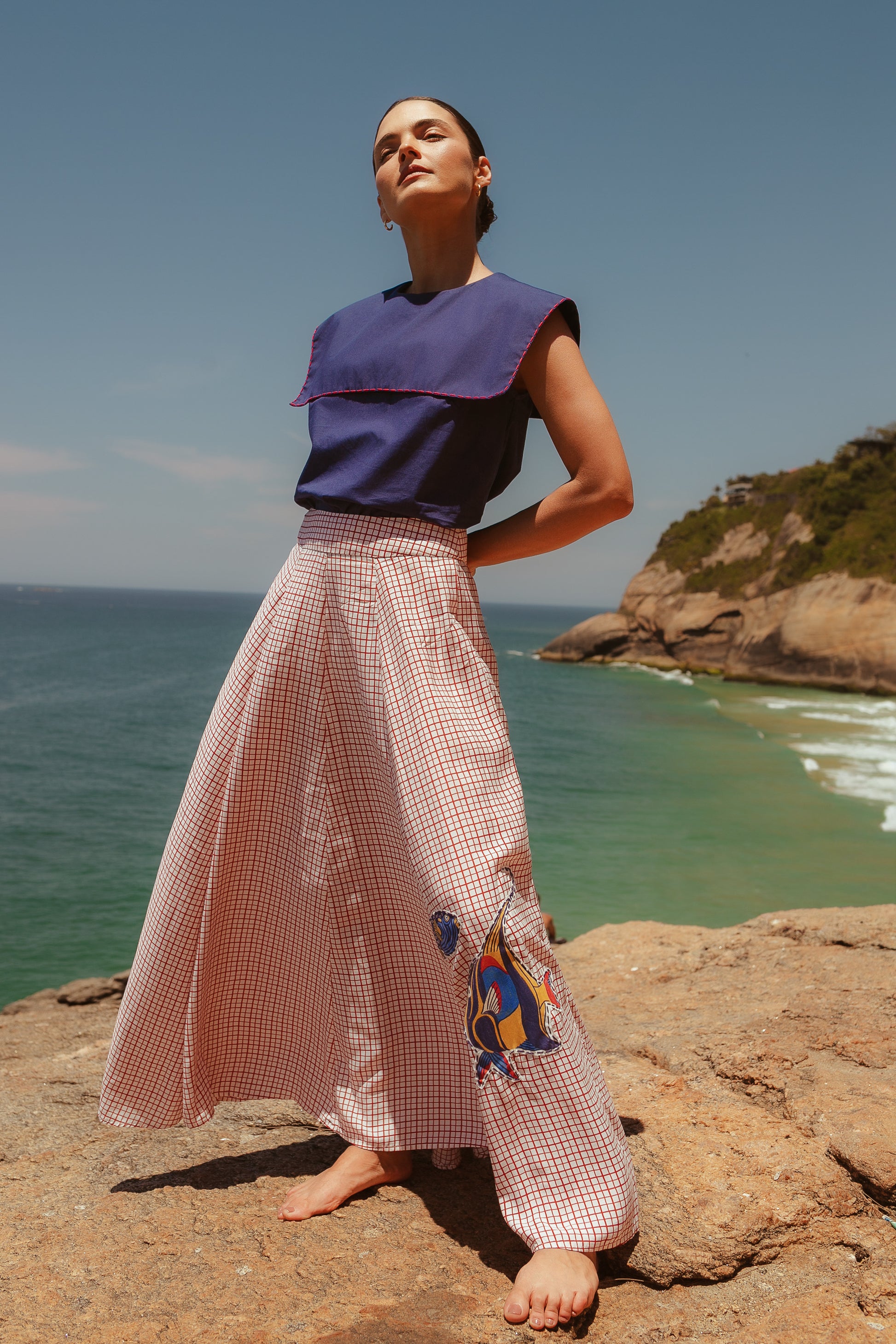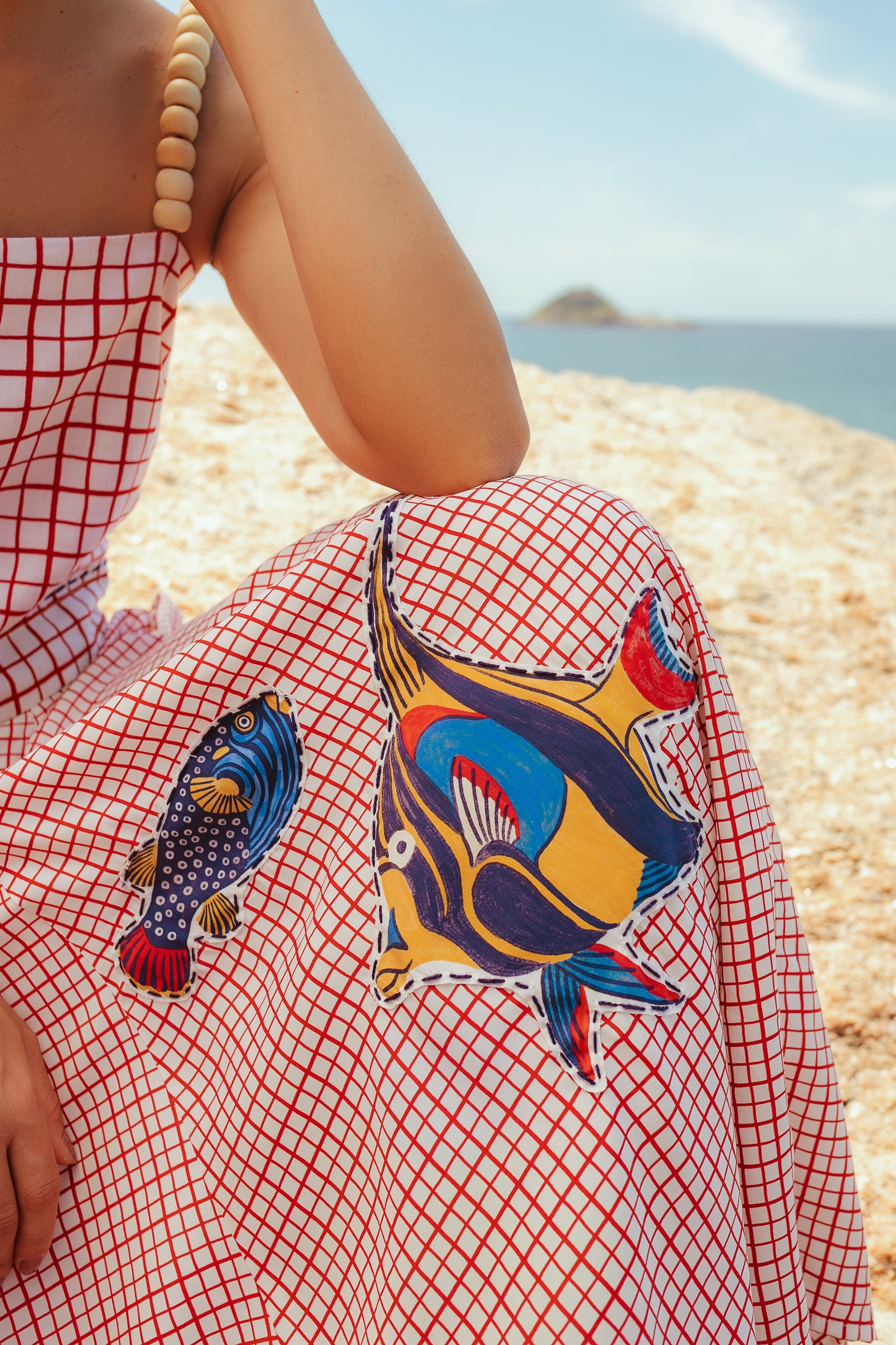 A Saia Ilha Bela traz leveza e movimento em cada detalhe. Sua modelagem ampla conta com nesgas e pregas que criam um balanço fluido e elegante, enquanto o fechamento em zíper nas costas garante praticidade. O grande destaque fica por conta dos peixes aplicados manualmente na lateral: cada um cortado, posicionado e finalizado com bordados à mão.