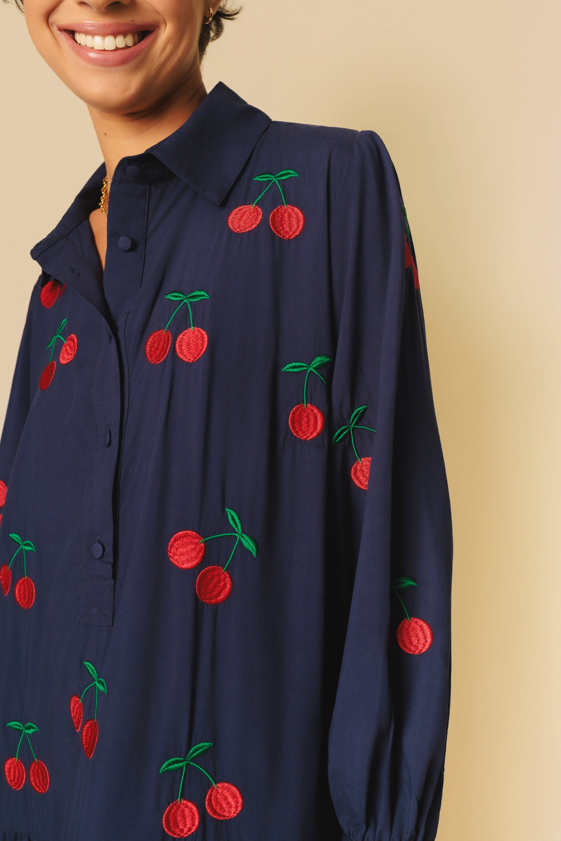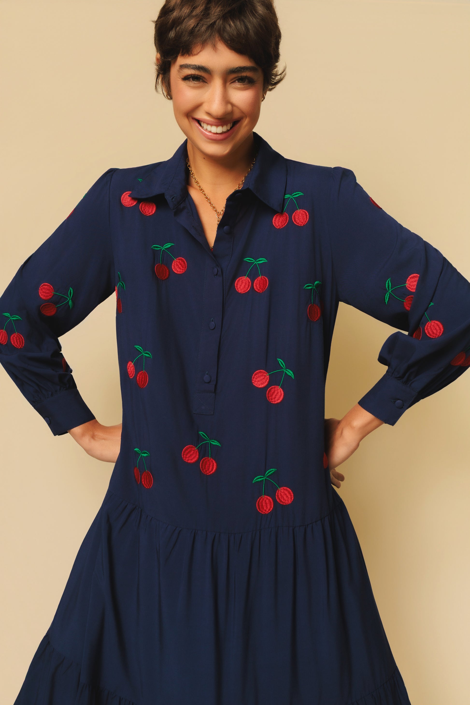Todo pensado na terra da garoa, o vestido Sampa é uma homenagem à cidade que acolhe a Mabô com tanto carinho. Com mangas longas e saia ampla, é perfeito tanto para dinâmica da grande cidade, quanto pra entrar namala das férias! Aqui ele recebe bordados de cerejas, dando charme e frescor ao look.