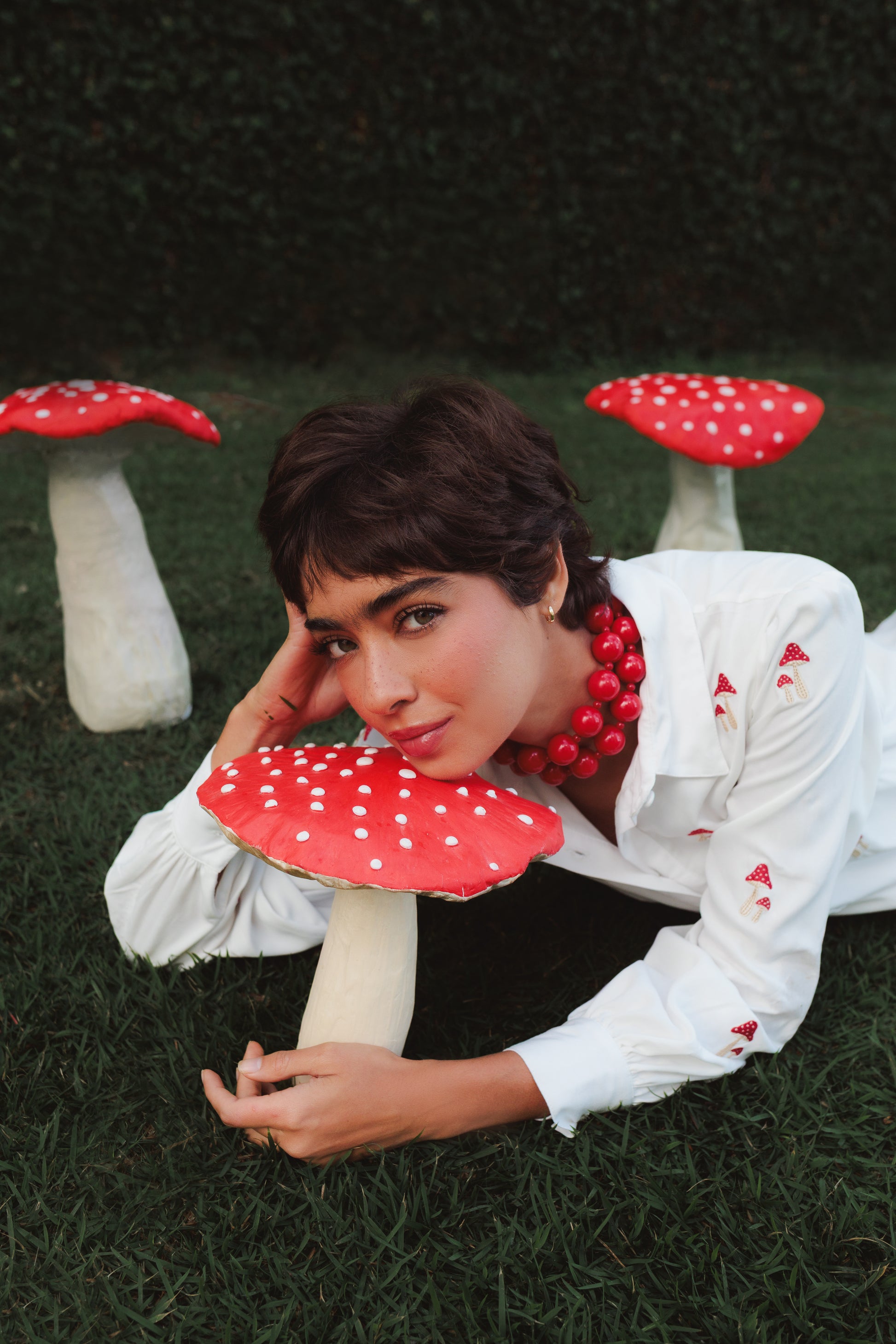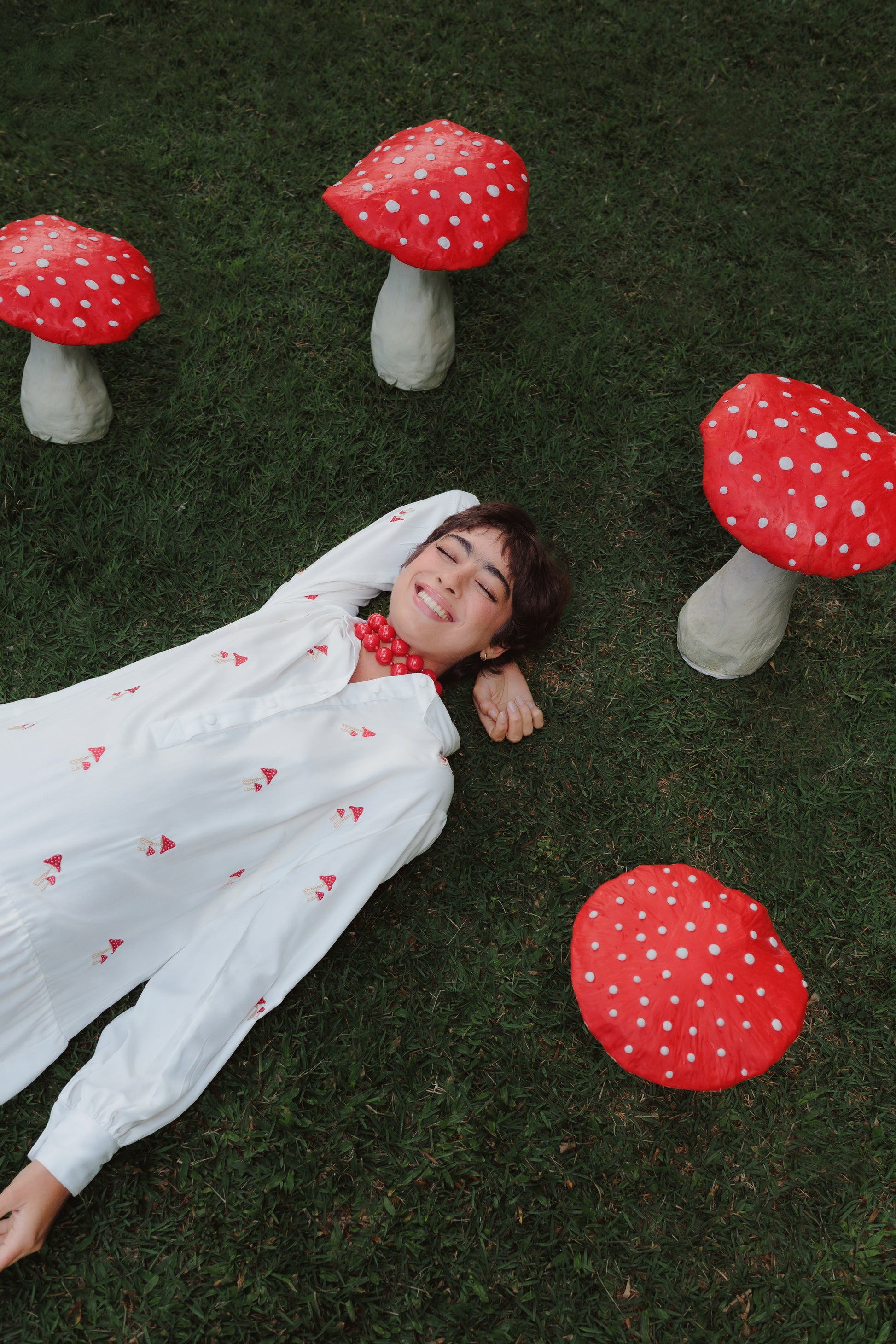 Todo pensado na terra da garoa, o vestido Sampa é uma homenagem à cidade que acolhe a Mabô com tanto carinho. Com mangas longas e saia ampla, é perfeito tanto pra dinâmica da grande cidade, quanto para entrar na mala das férias! Aqui ele recebe bordados em cogumelos, dando todo um toque lúdico e divertido à peça.