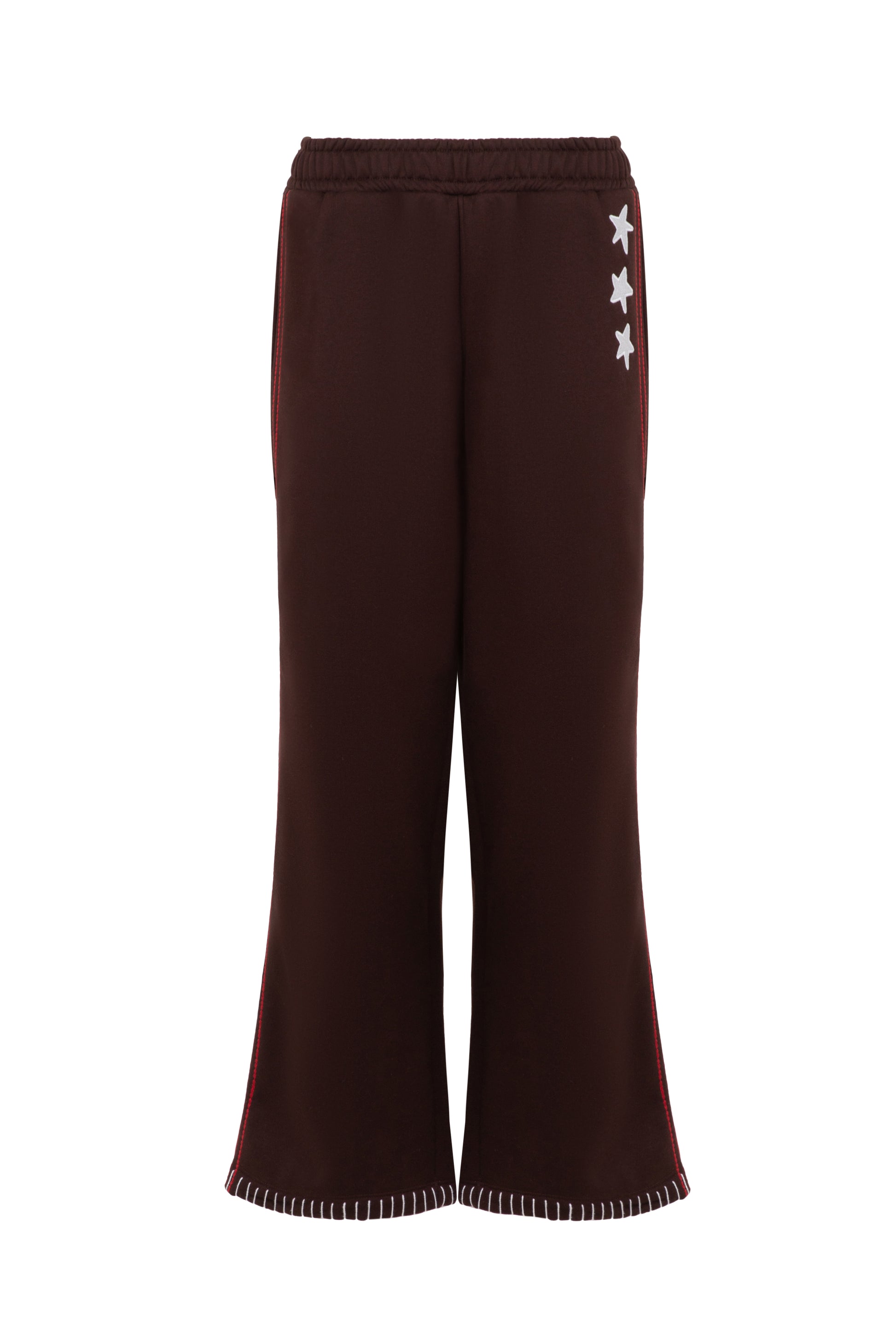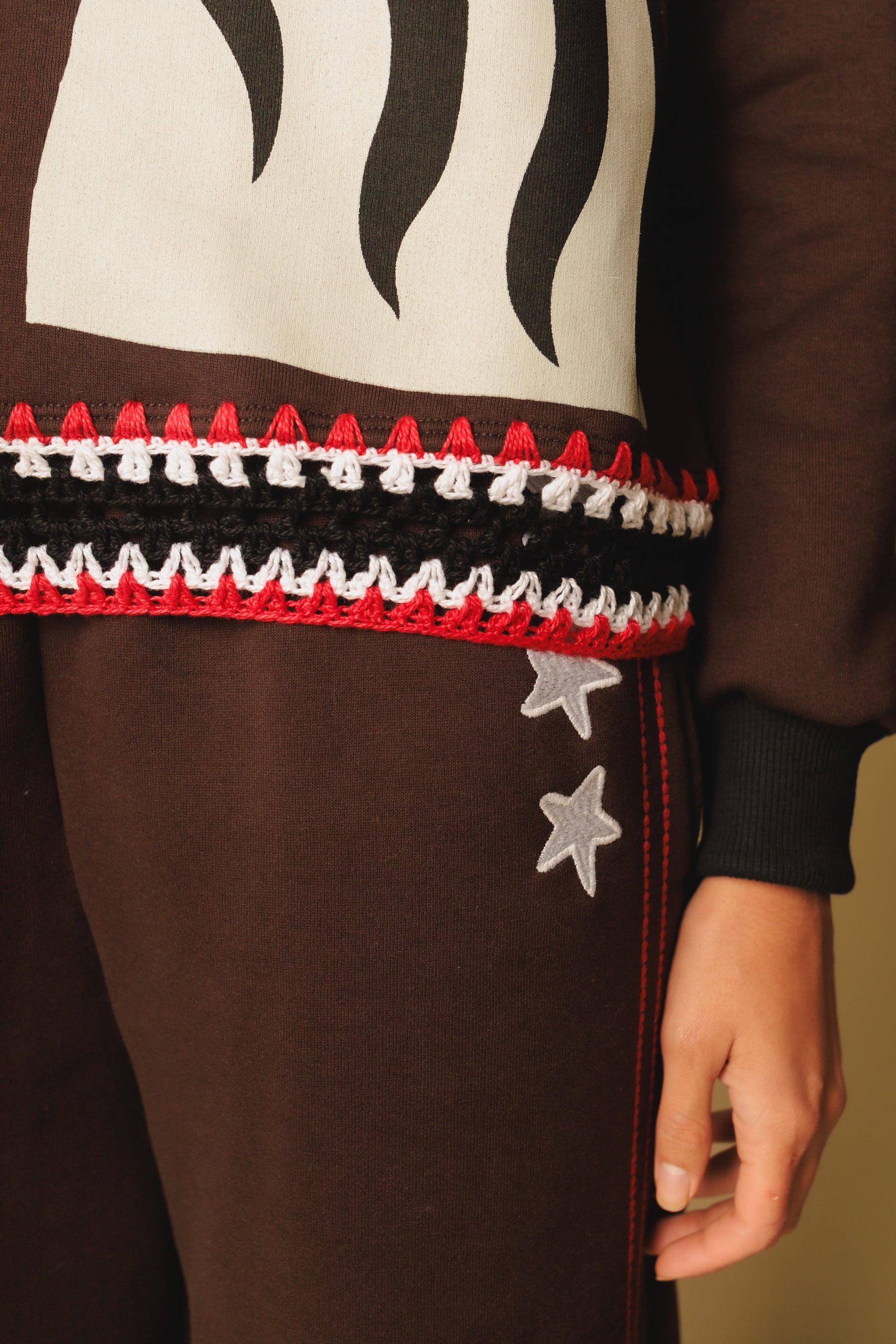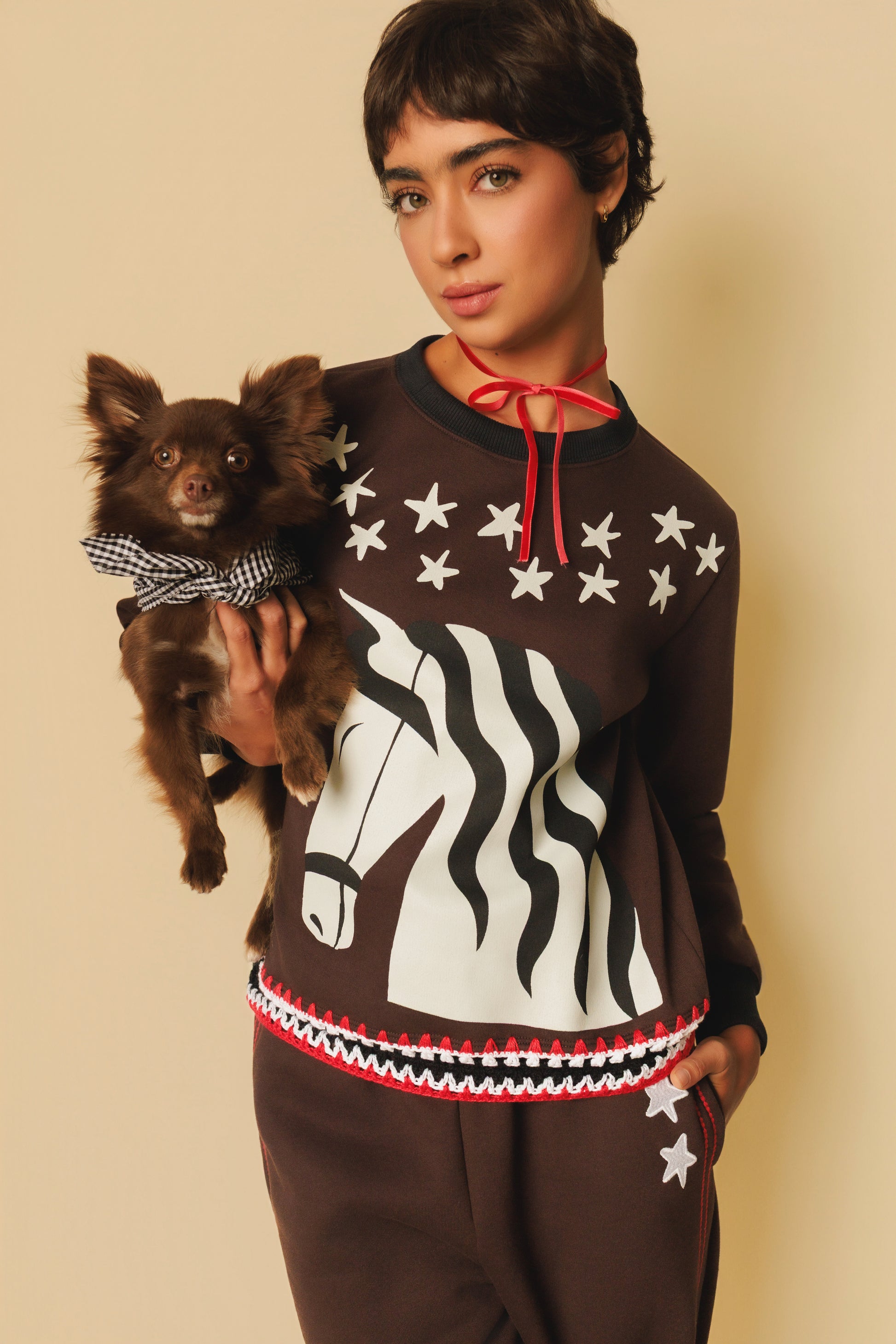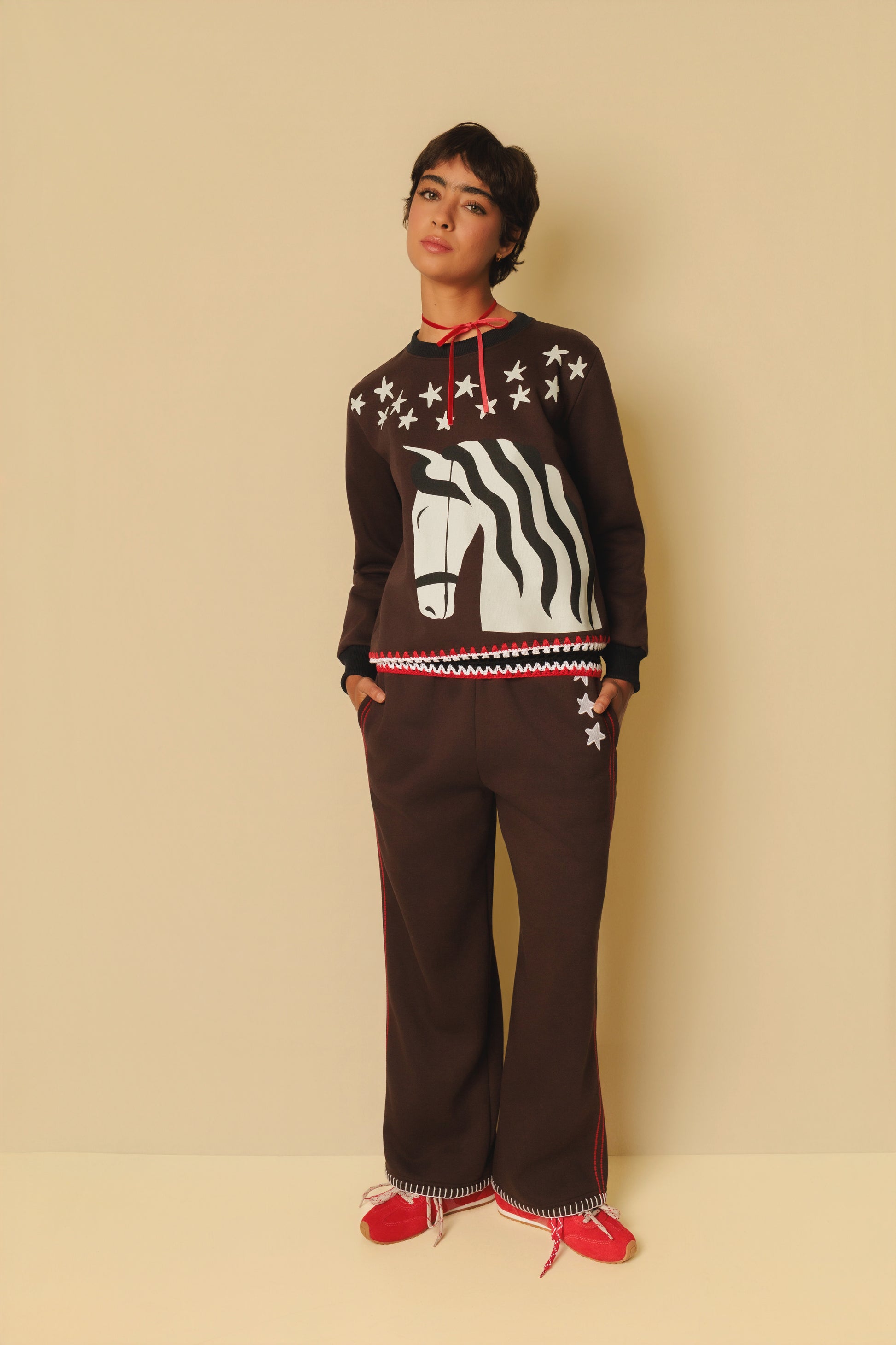 Conforto e arte se encontram no Moletom Marajó. Com silk artesanal retratando um imponente cavalo e barra em crochê feita à mão, ele traduz o equilíbrio perfeito entre casualidade e moda artesanal. Para compor, a calça recebe bordados de estrelas à máquina, pontinhos laterais e, como toque final, bordado dente de cão feito à mão na bainha — um charme extra que carrega toda a identidade da Mabô.