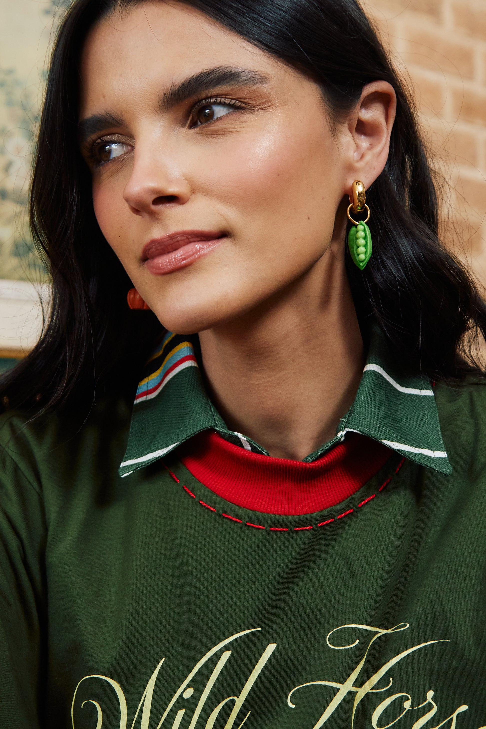 Com silk artesanal exclusivo, a T-Shirt Wild Horses traz uma ilustração especial da coleção Doce Refúgio. Os detalhes feitos à mão enriquecem ainda mais a peça: pontinhos delicados na gola e nas mangas, além de biquinho de crochê aplicado na barra da manga. A gola em ribana contrastante adiciona um toque moderno e cheio de estilo, transformando a t-shirt em um amuleto de originalidade.
