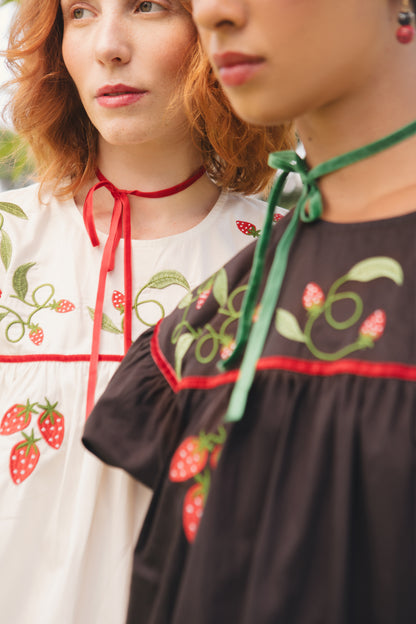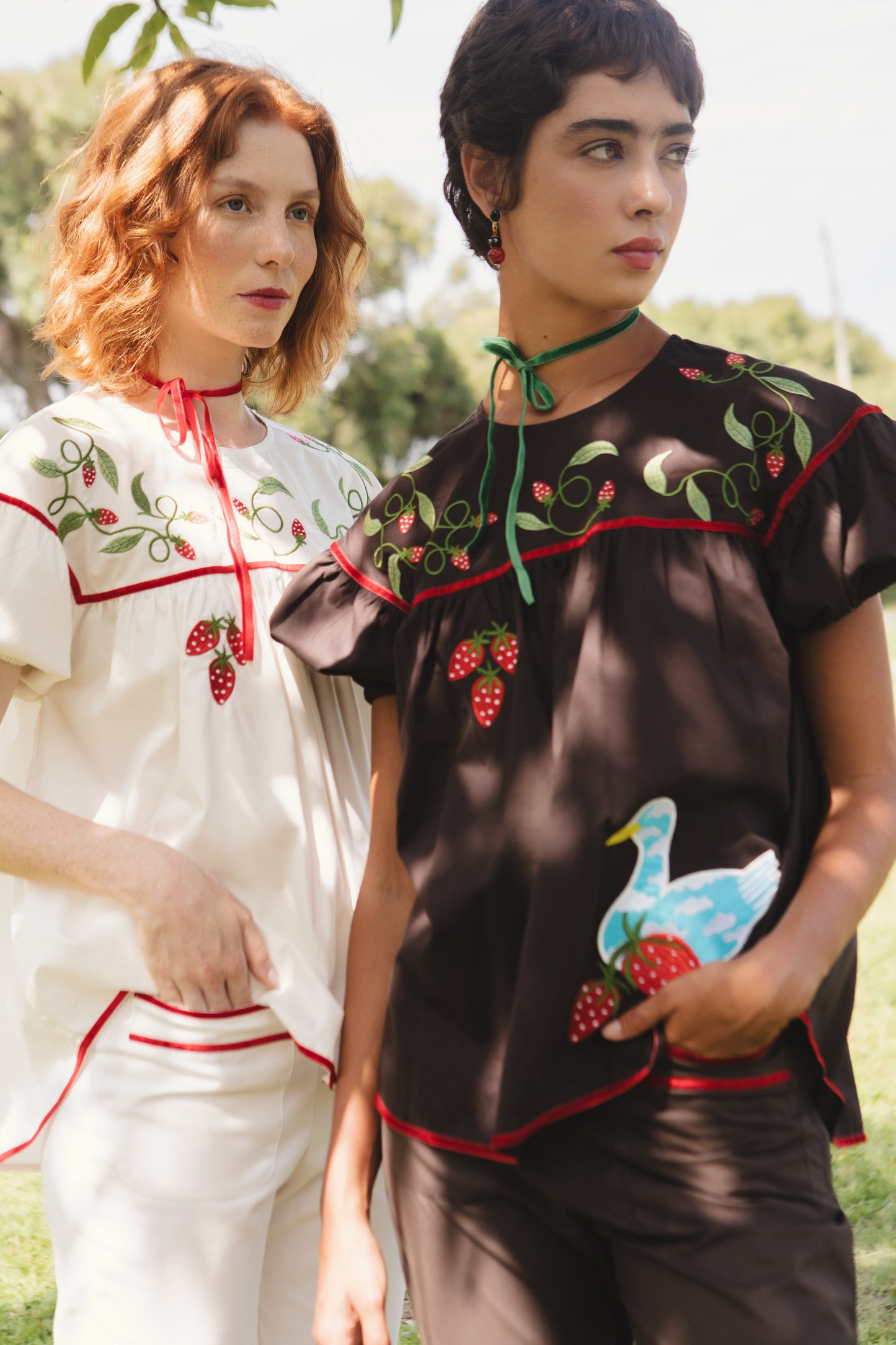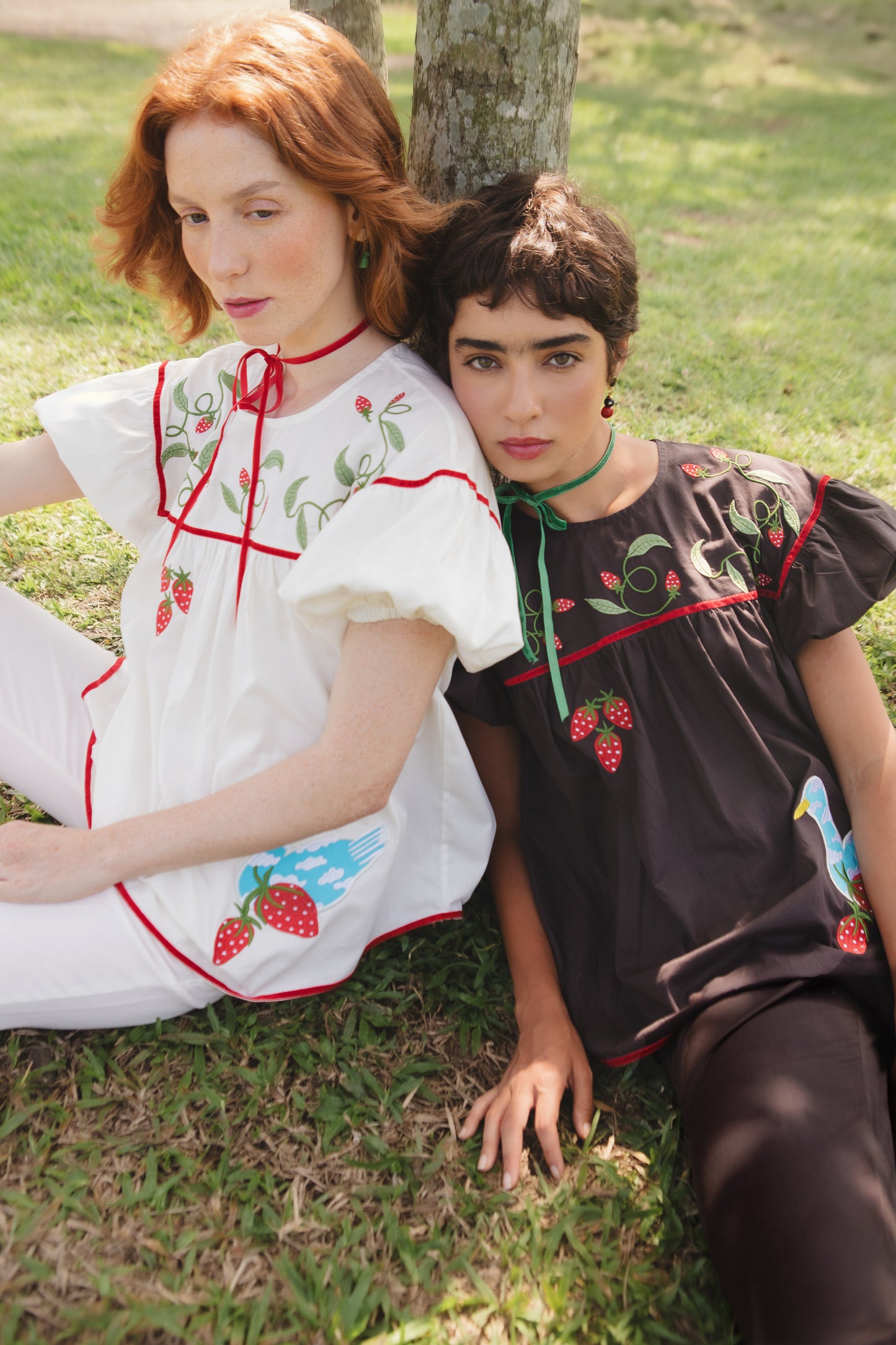 A Bata Encanto de Morangos é puro romantismo. Com moranguinhos e folhinhas bordados à máquina, além de um patinho encantador com aplicação e bordado, a peça celebra o lúdico e o artesanal. As fitas de veludo aplicadas completam o visual com um toque clássico e sofisticado. Perfeita para quem ama peças leves, poéticas e cheias de cuidado nos detalhes.