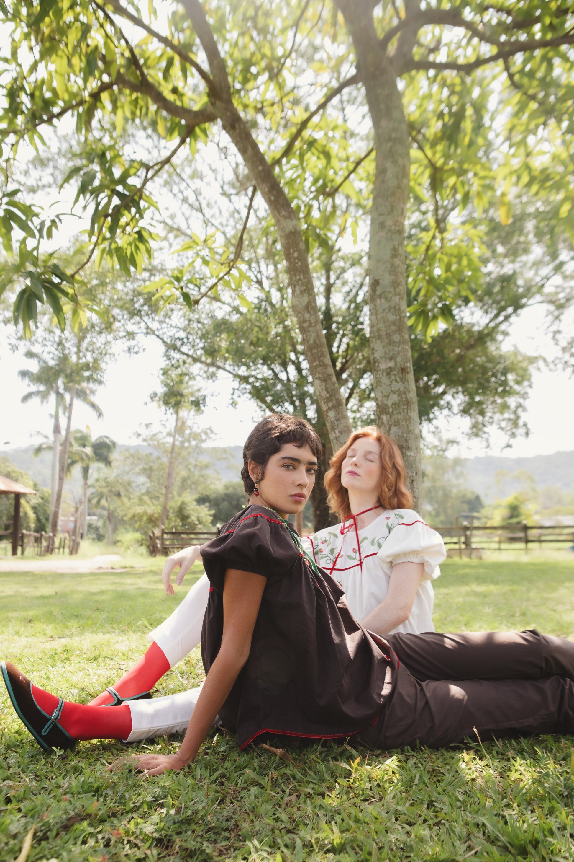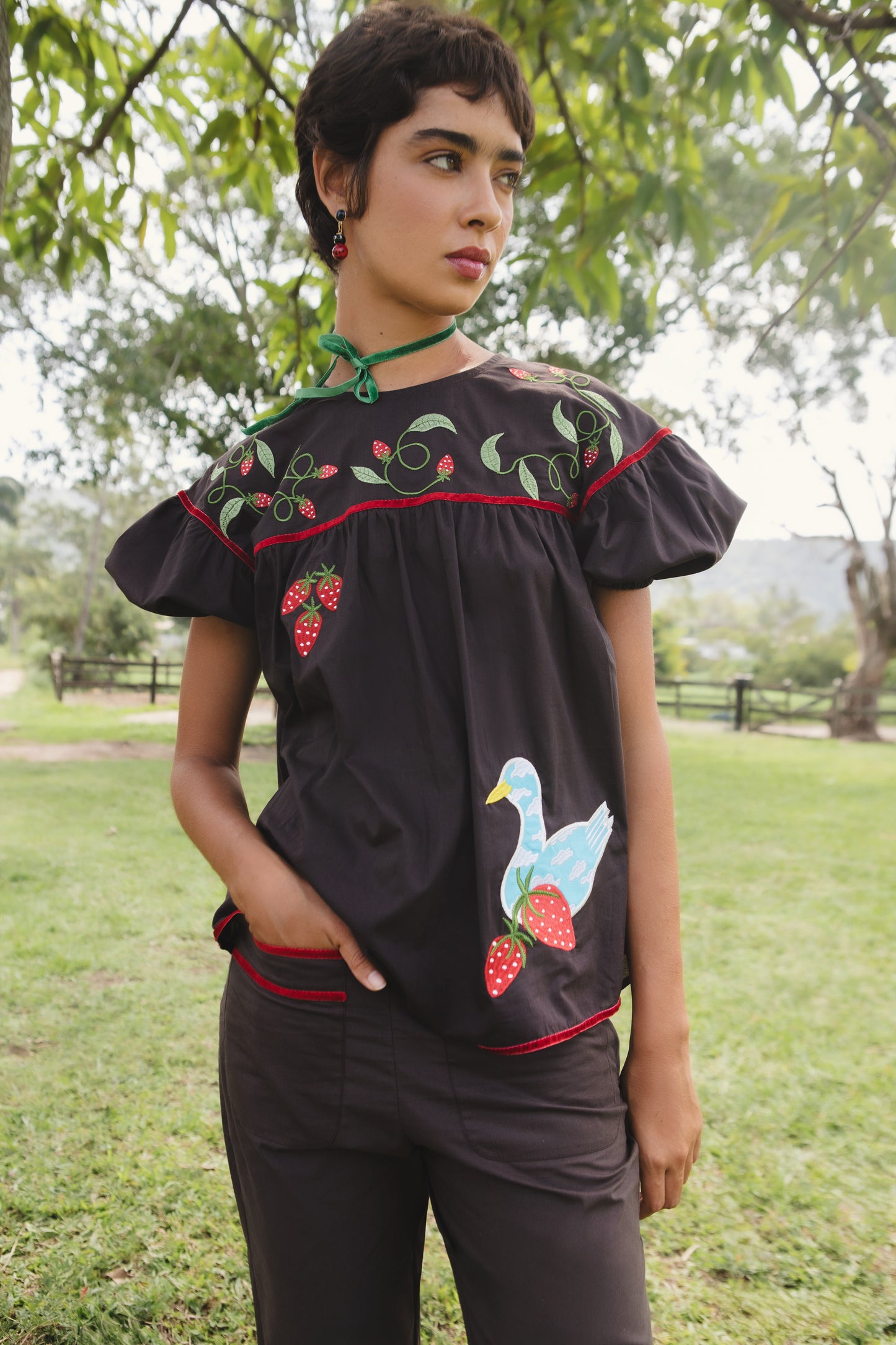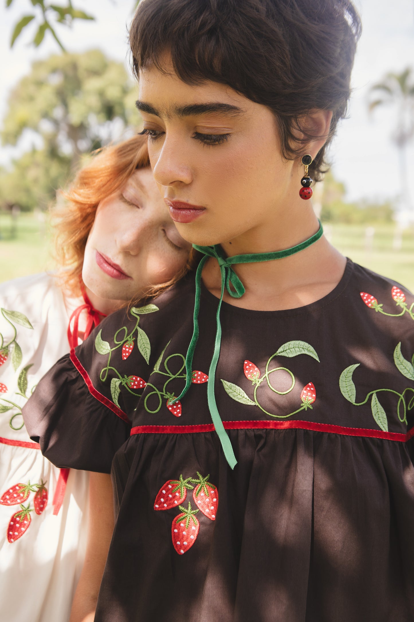 A Bata Encanto de Morangos é puro romantismo. Com moranguinhos e folhinhas bordados à máquina, além de um patinho encantador com aplicação e bordado, a peça celebra o lúdico e o artesanal. As fitas de veludo aplicadas completam o visual com um toque clássico e sofisticado. Perfeita para quem ama peças leves, poéticas e cheias de cuidado nos detalhes.