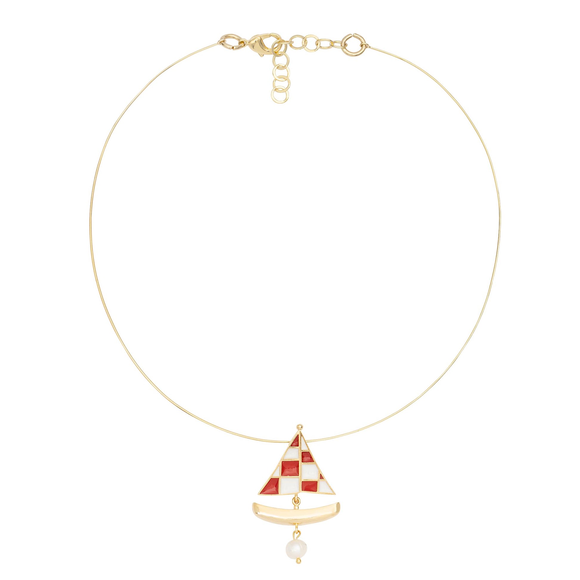 Criada em parceria com a Triana, a Gargantilha Veleiro é uma peça que surge do encontro de duas marcas contadoras de histórias. Feita à mão, possui pingente de barco que navega sobre um xadrez de resina branca e vermelha, representando o nosso universo lúdico. Pensada para ser protagonista da sua produção, ilumina o colo com um toque de cor divertido. DICA: Se você curte conjunto, combine com o Brinco Mini Veleiro para uma composição cheia de graça!
