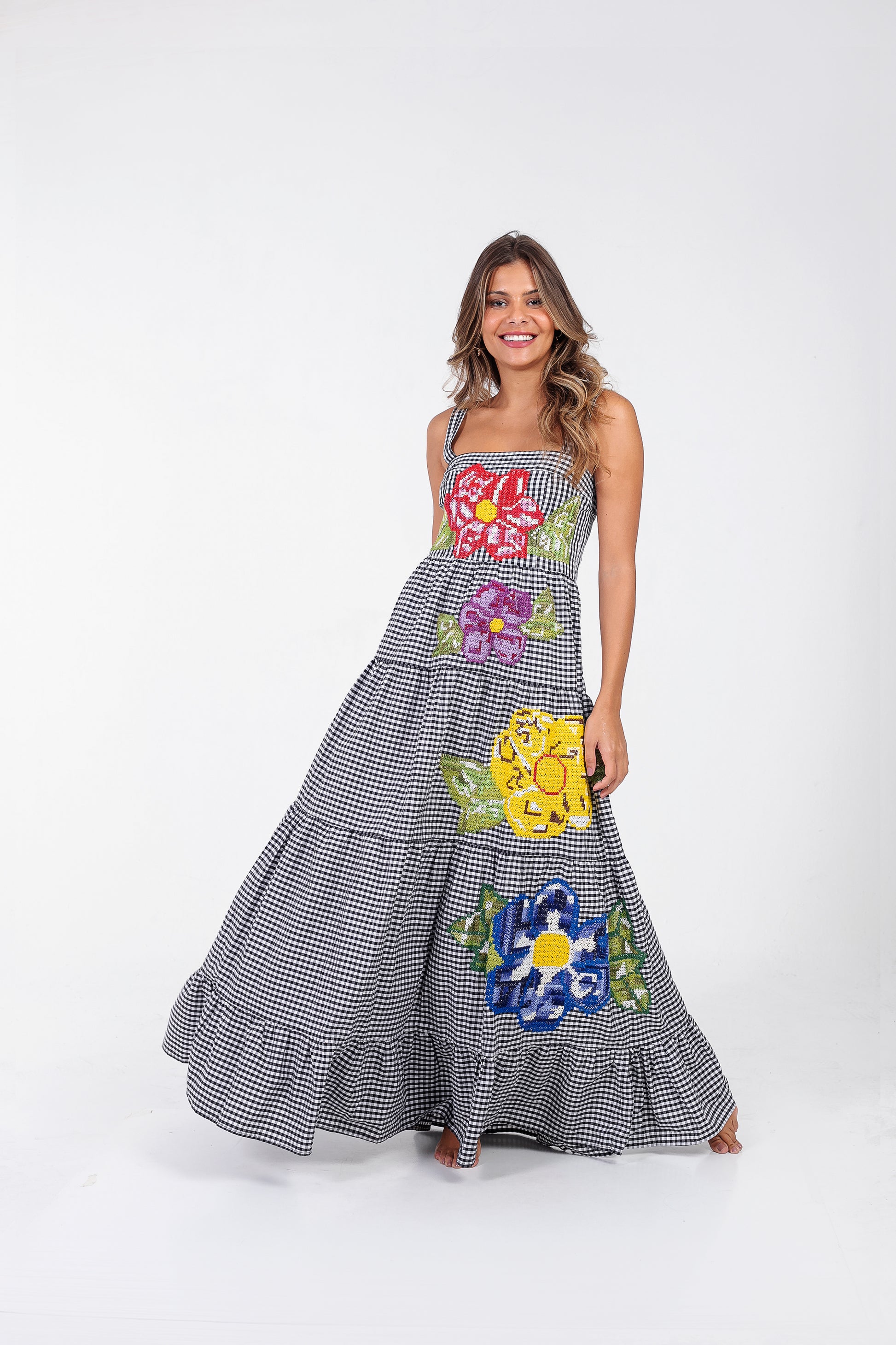 Vestido Amanda Flor Ponto Cruz - vichy preto