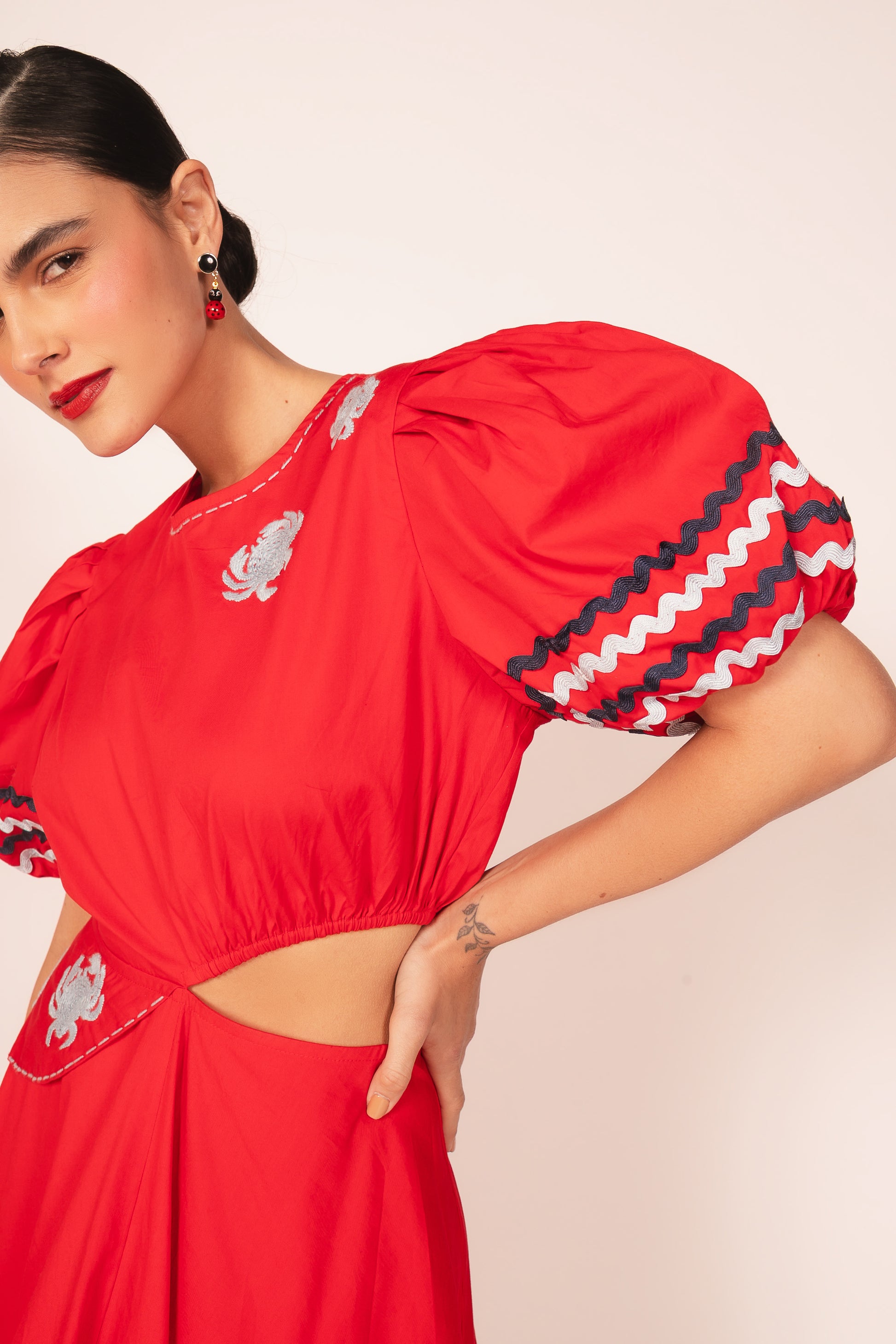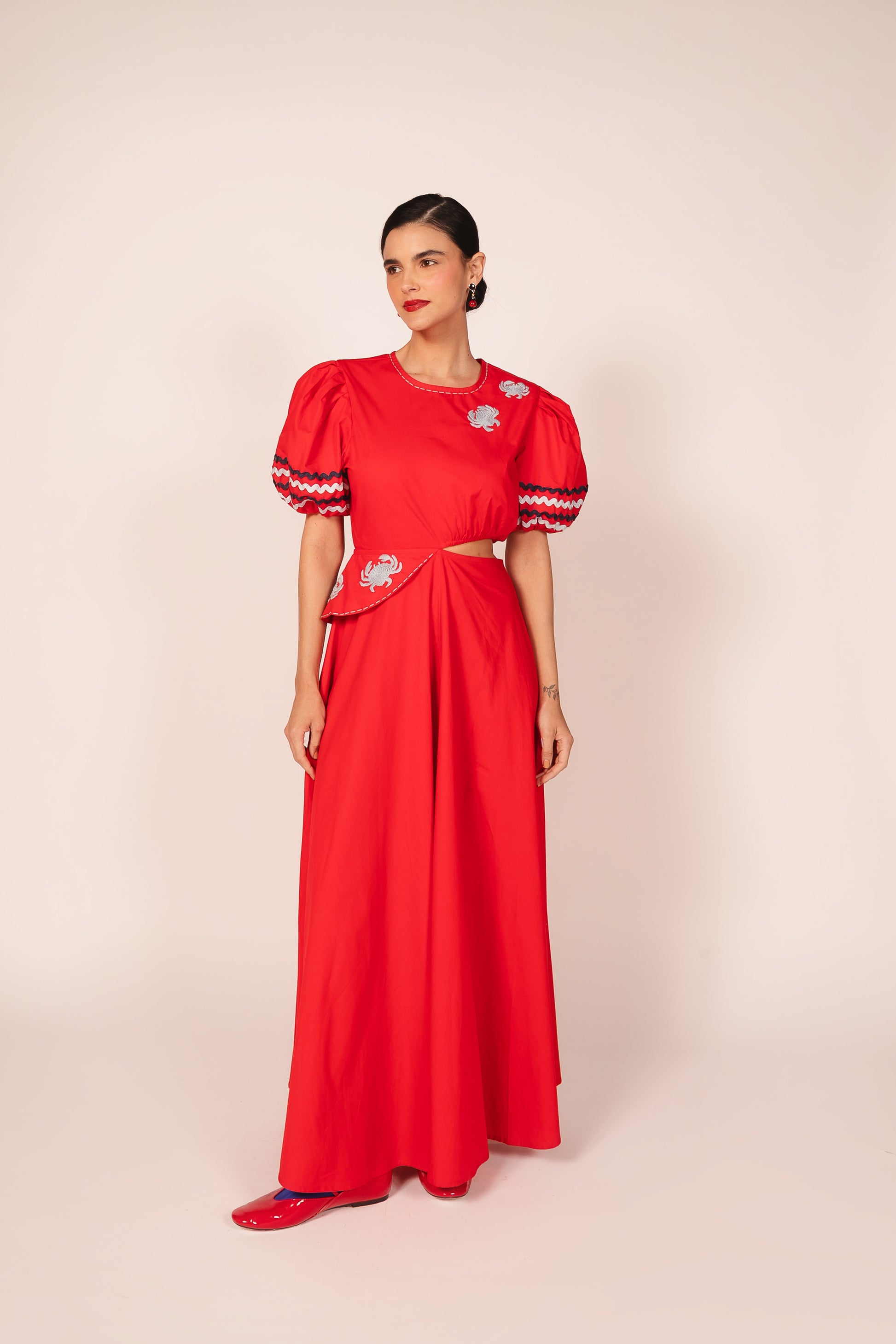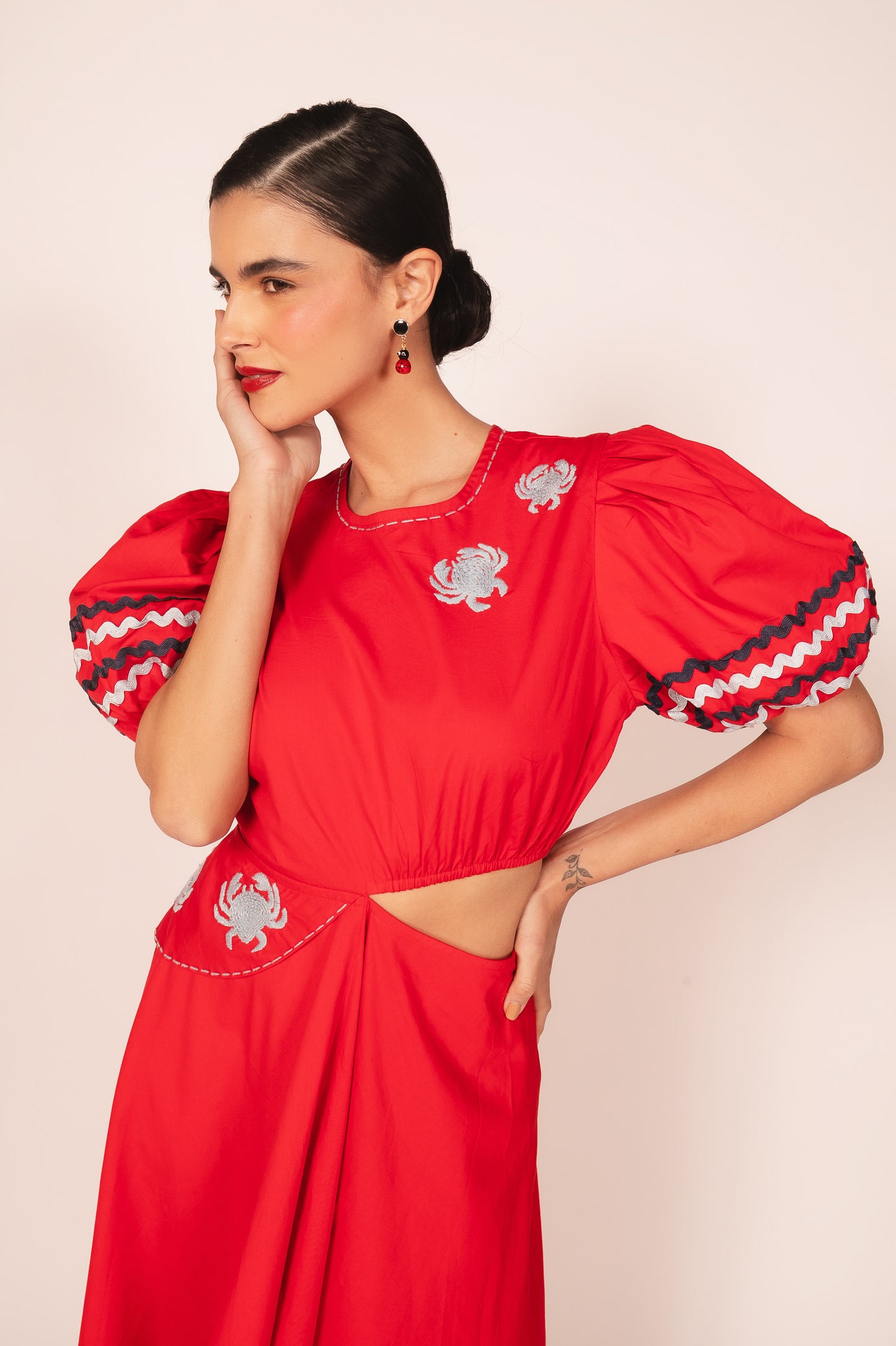 Em um trabalho encantador de reinvenção, o nosso clássico Vestido Harmonia retorna em nova versão: agora com caranguejos bordados à mão! Para completar o visual, as aplicações de sianinhas e os bordados delicados feitos à mão na gola e no babado trazem leveza e poesia.