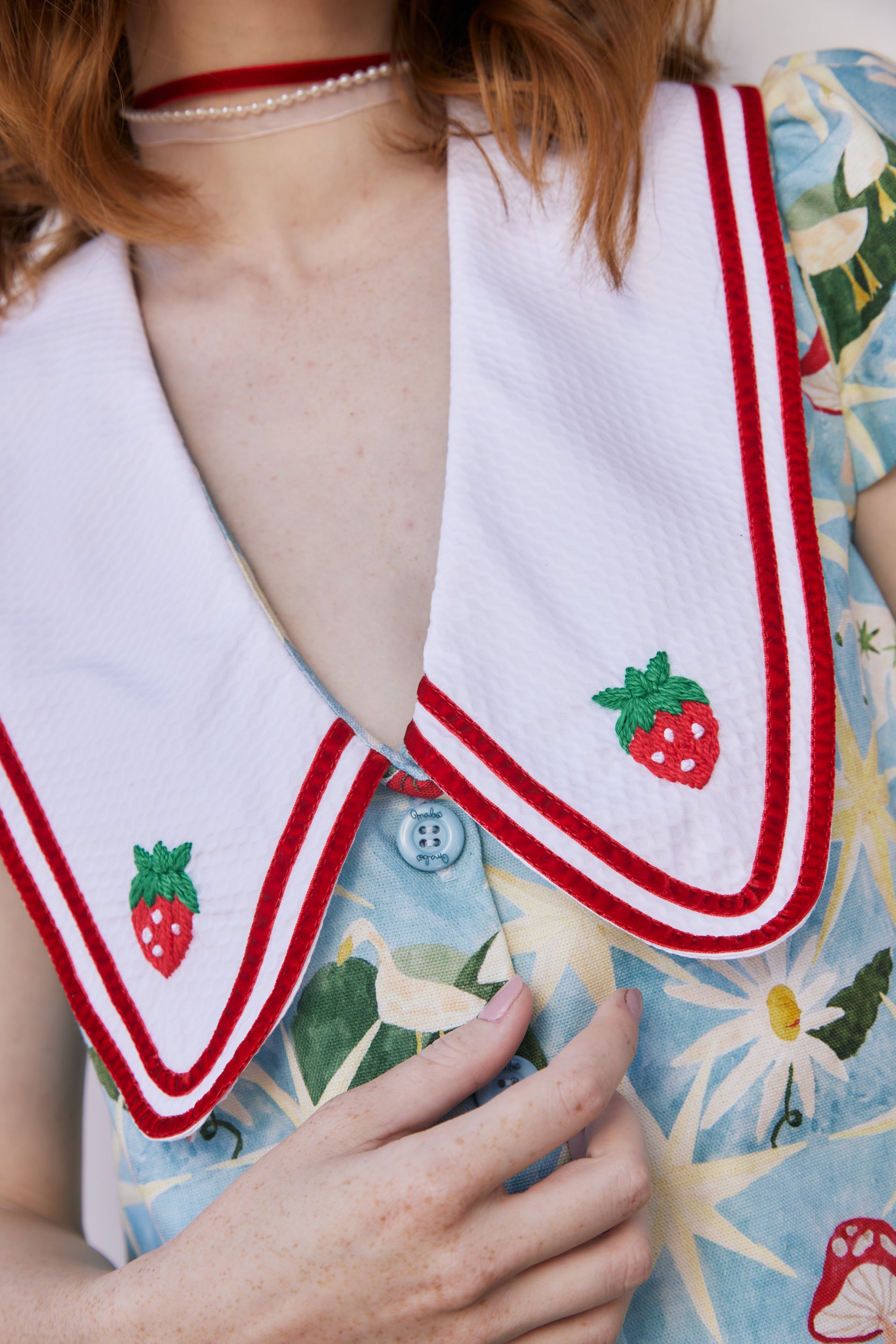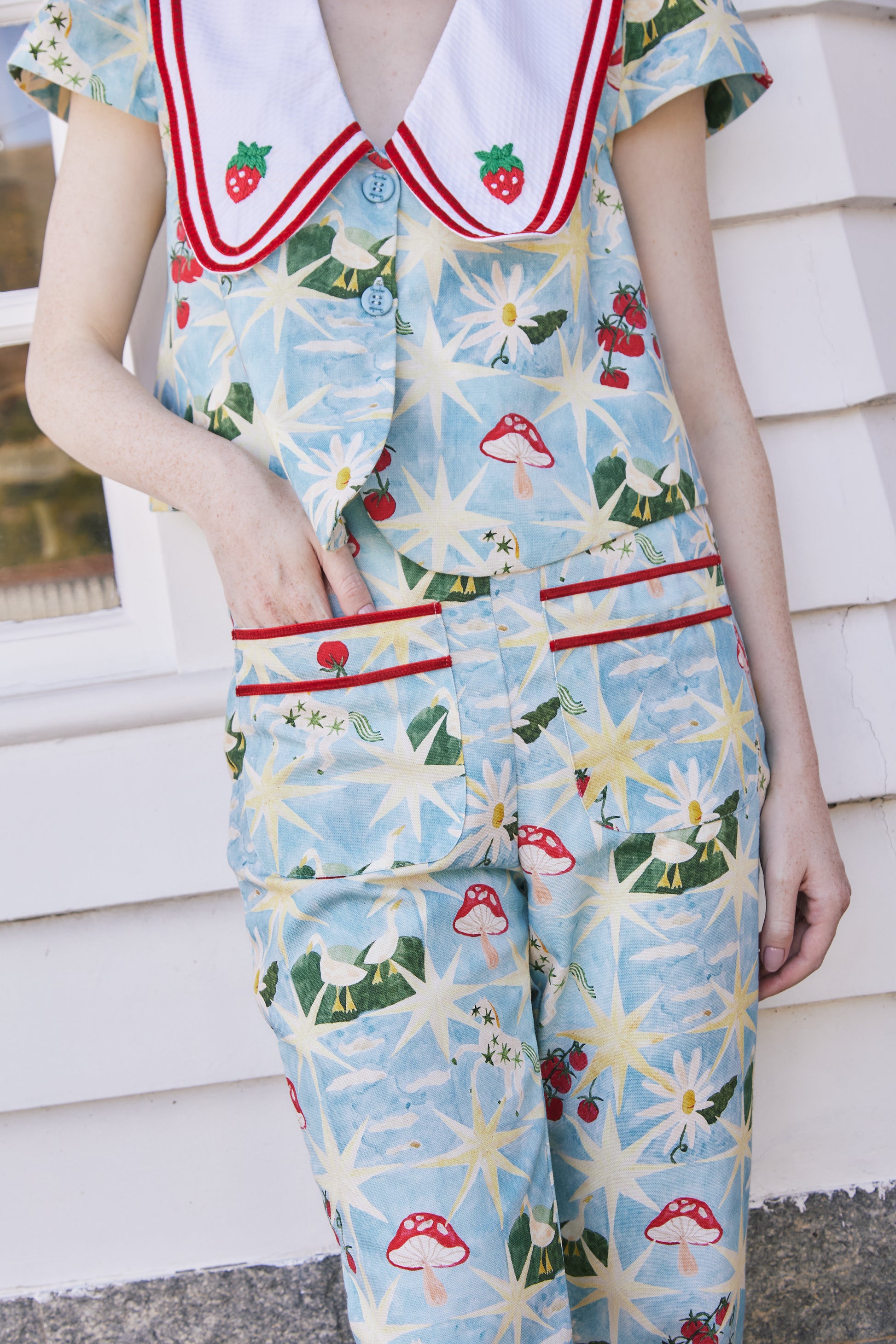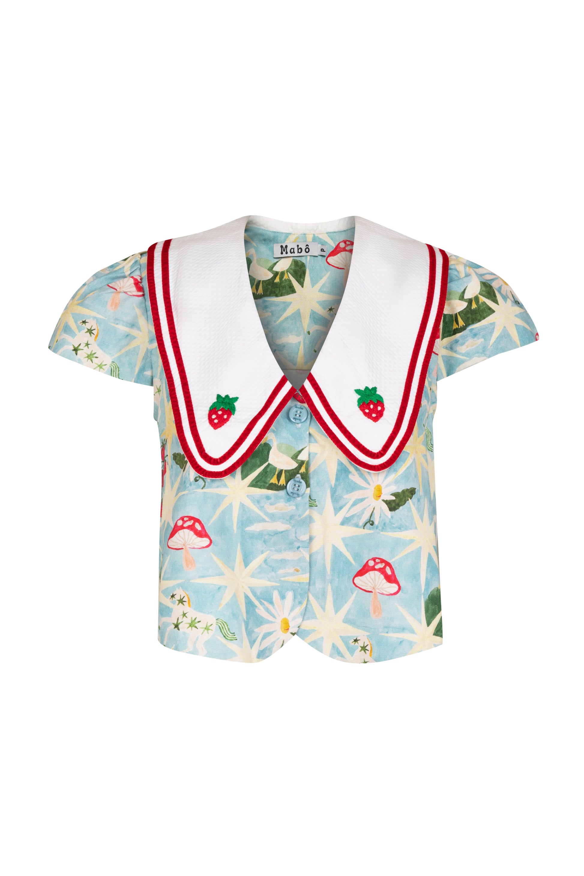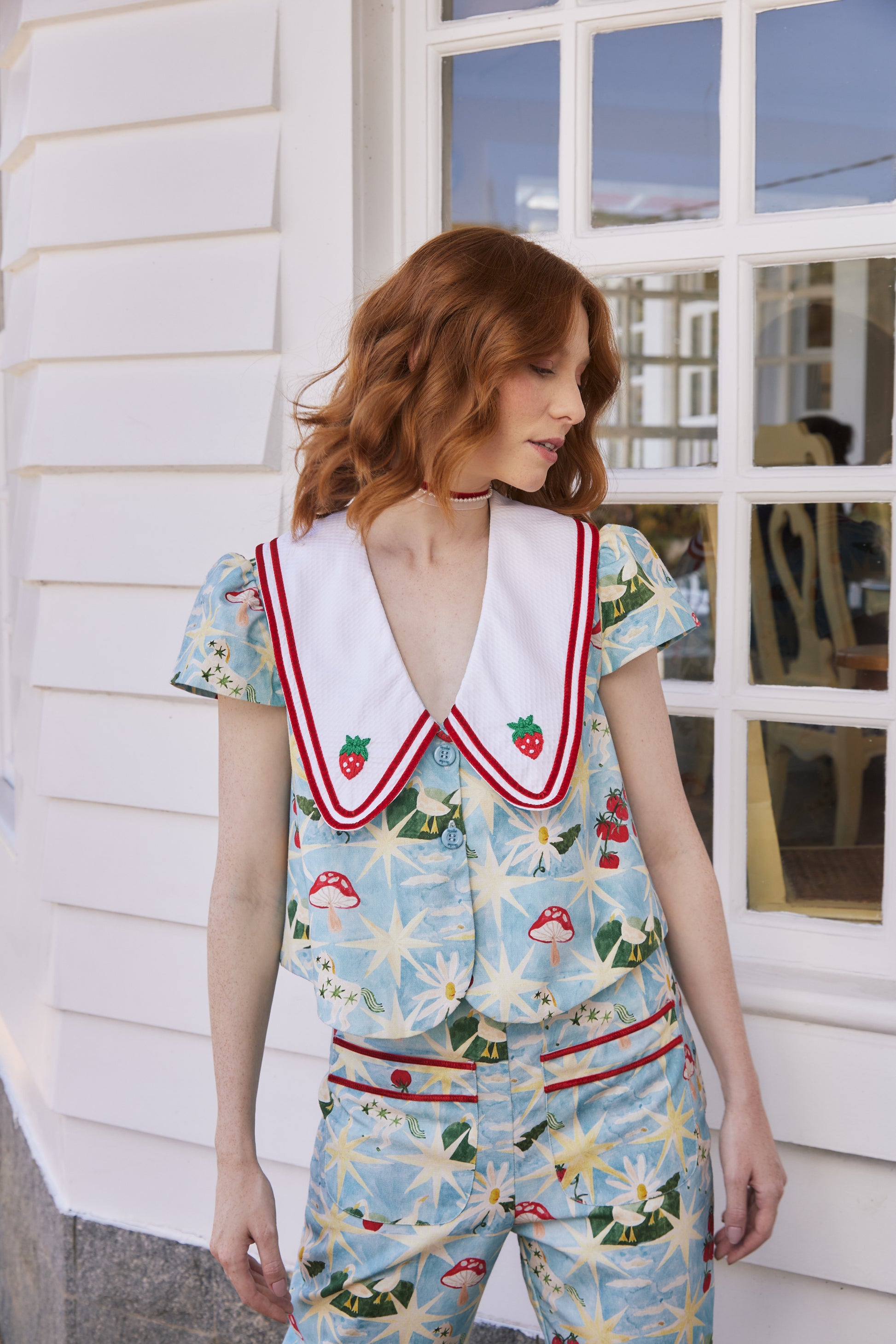 O Colete Constelação é uma peça encantadora, com estampa exclusiva Mabô. A gola em piquet recebe aplicação de fita de veludo e delicados mini morangos bordados à mão, traduzindo cuidado em cada detalhe. O fechamento é feito com botão personalizado Mabô, tingido na cor do tecido, e as mangas tulipa reforçam o formato e trazem volume. O shape diferenciado com bainha arredondada dá movimento e originalidade ao colete. A estampa Doce Refúgio foi desenvolvida a partir de uma pintura, portanto pode apresentar variações na sua localização, tornando cada peça única — um charme a mais que reforça o caráter artesanal da Mabô.
