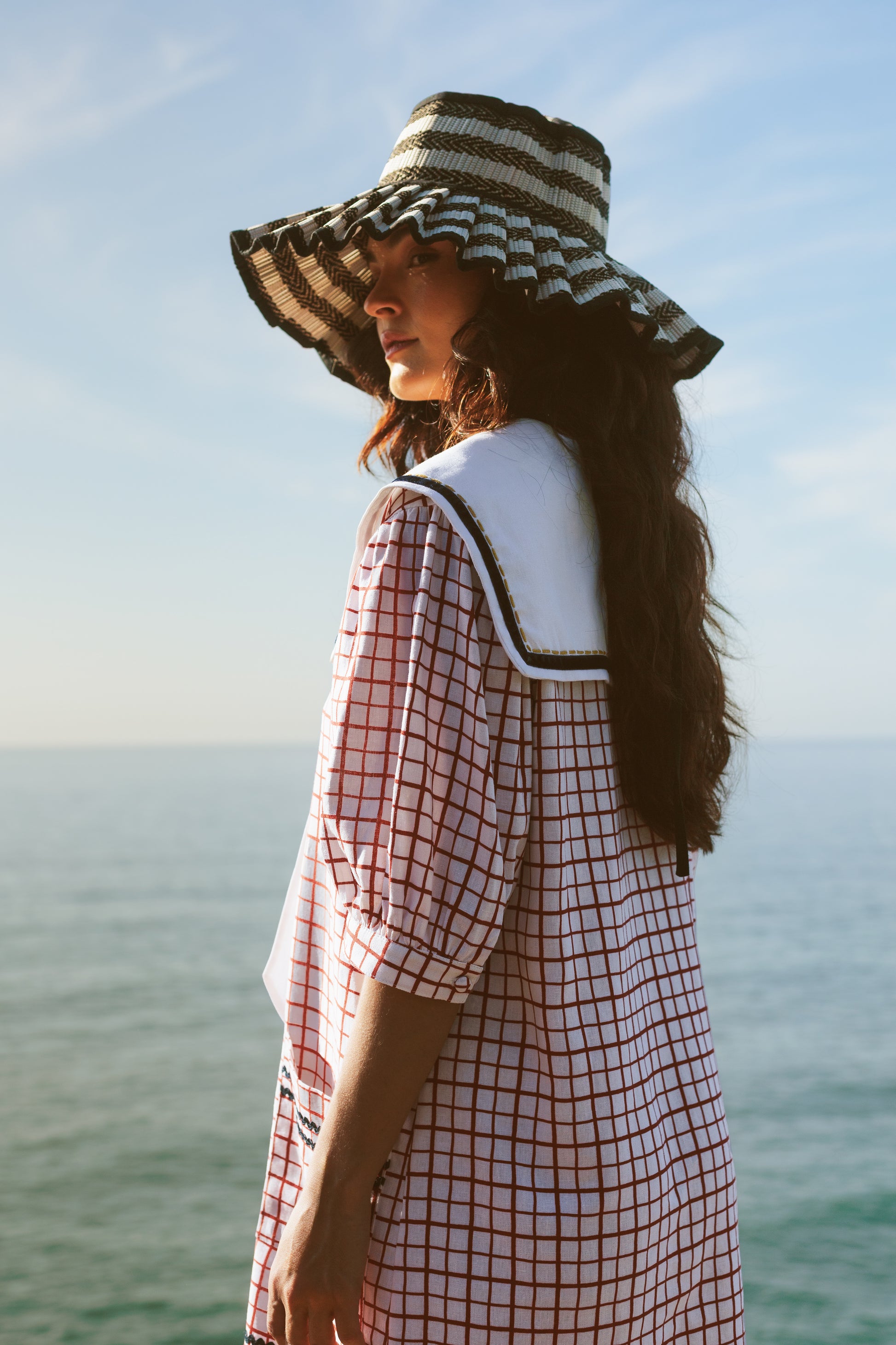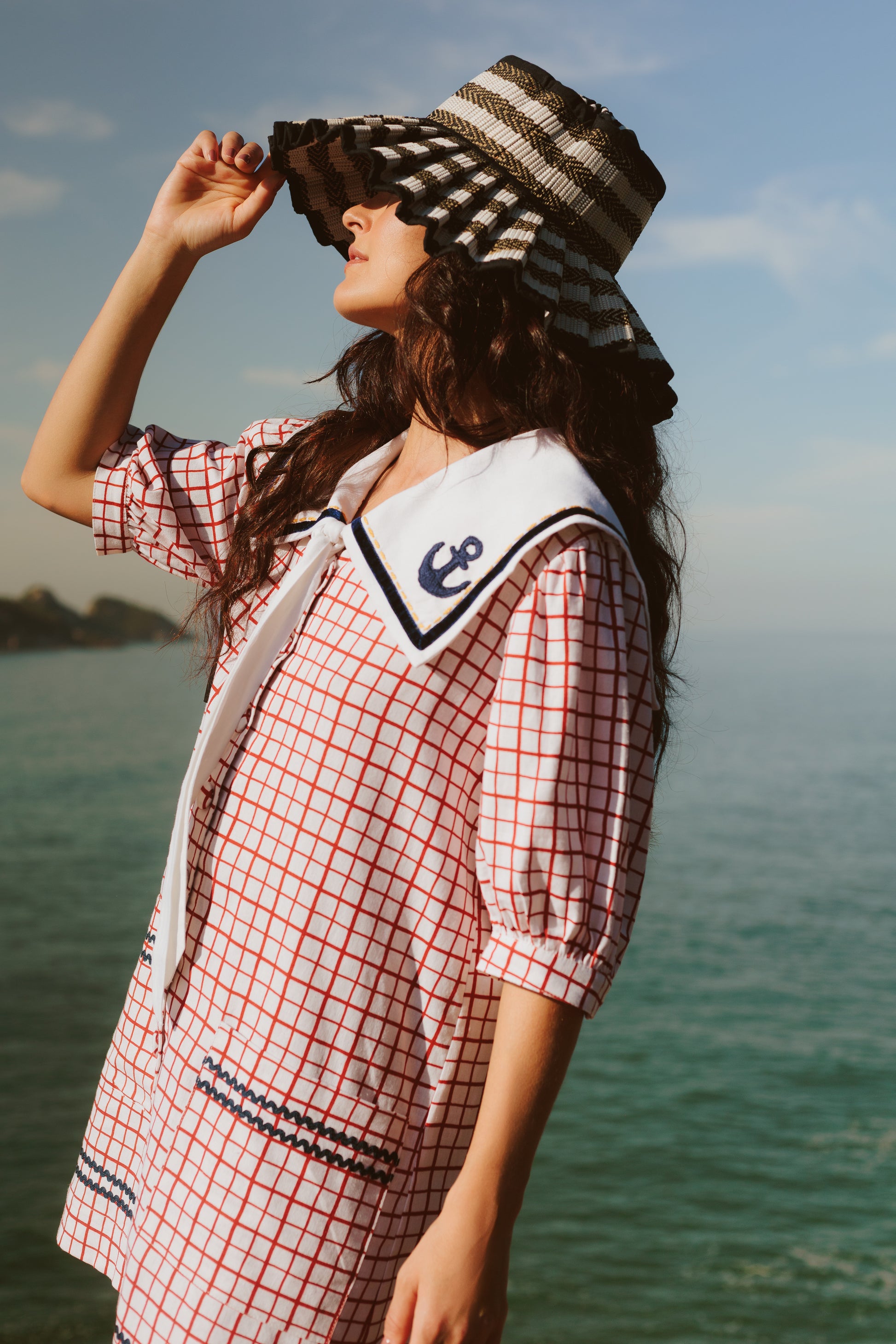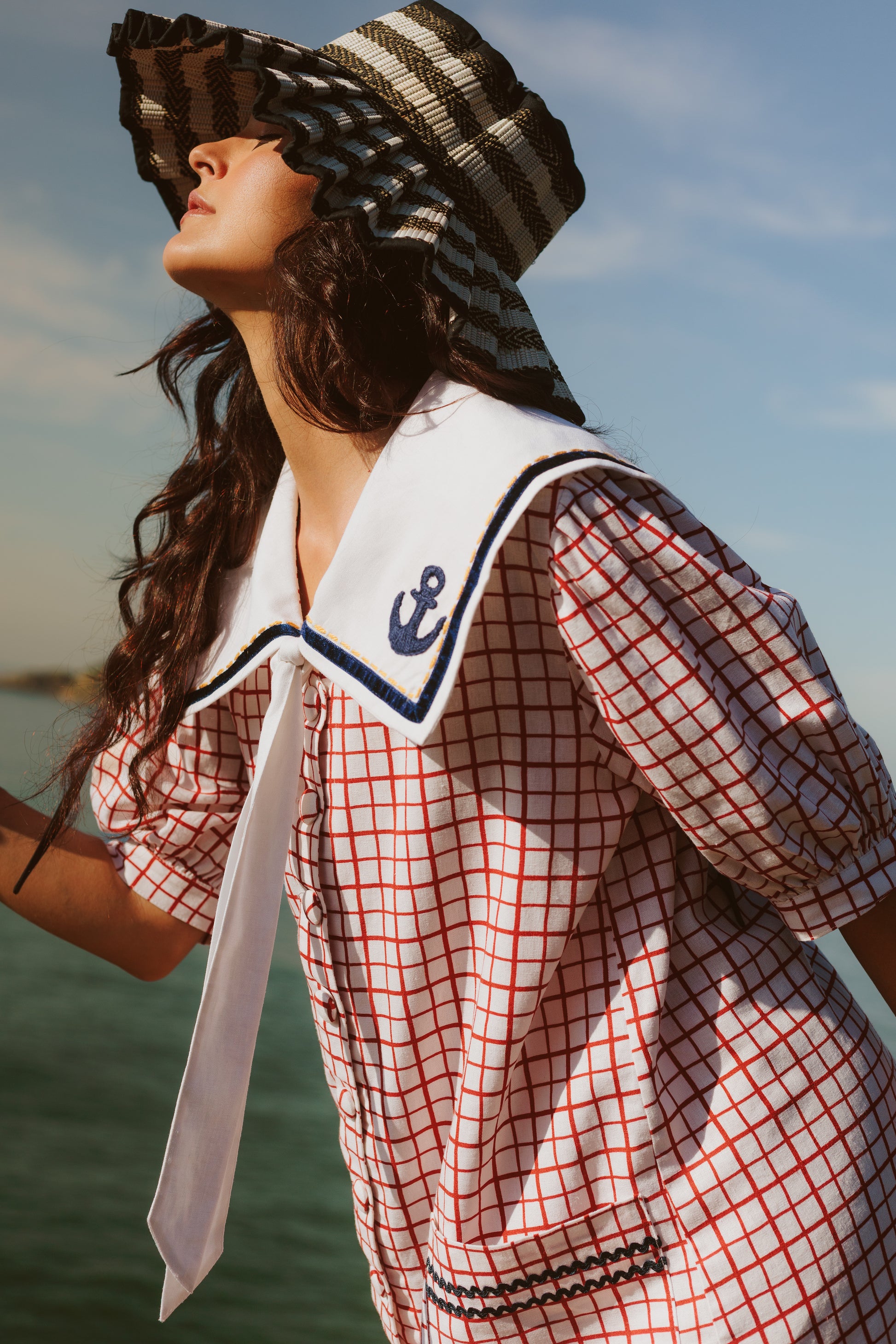 O Vestido Navy Patacho é super charmoso e foi desenvolvido em linho com estampa exclusiva Mabô. Possui abotoamento frontal com botões forrados, bolso com aplicação de sianinhas e gola com gravatinha em fustão, totalmente bordadas à mão. Uma peça cheia de delicadeza e cuidado artesanal em cada detalhe.