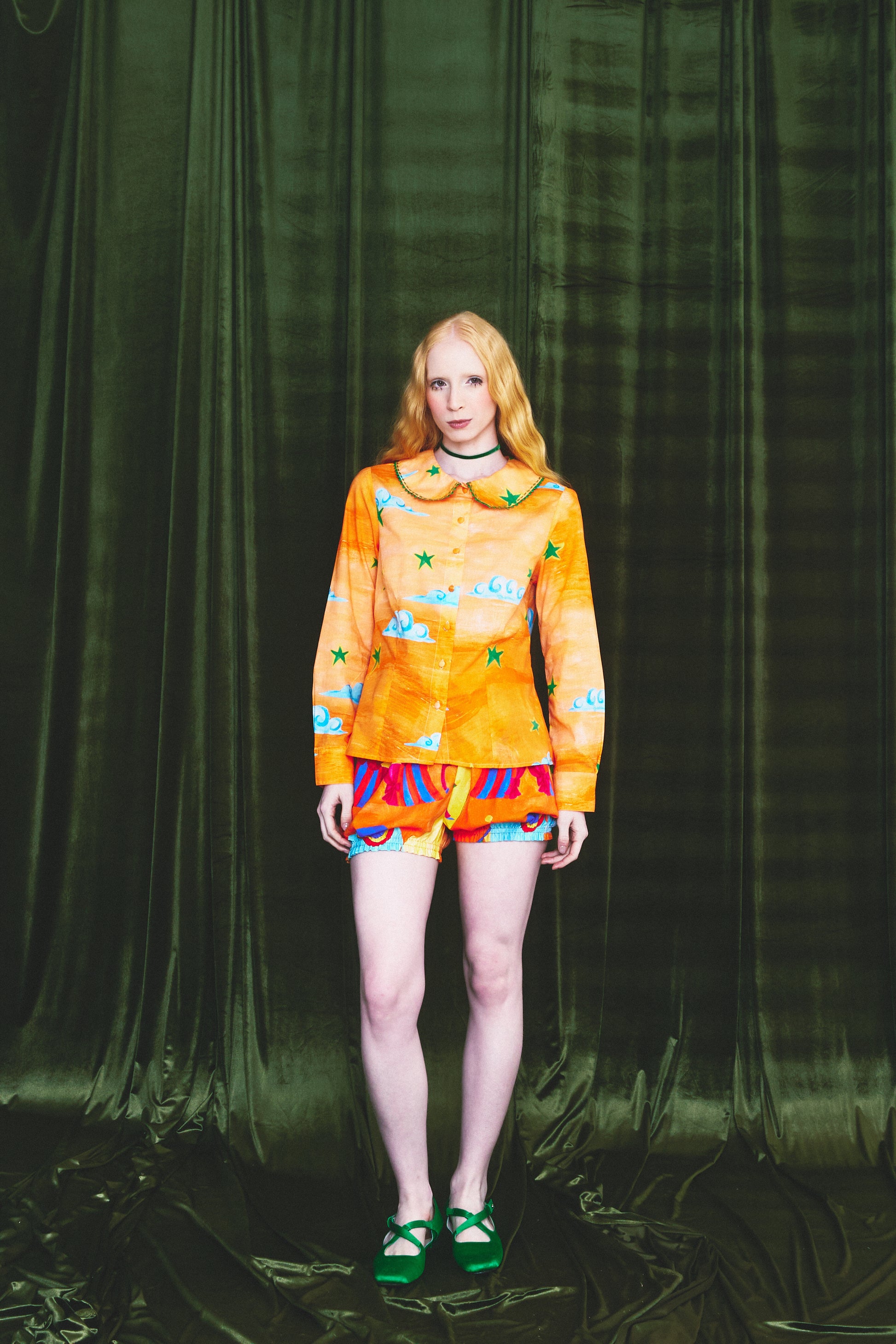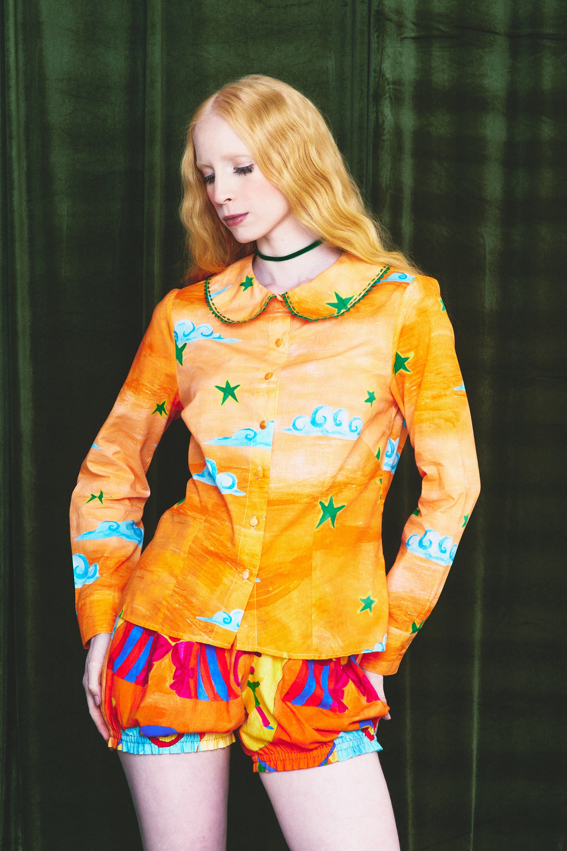 Feita em algodão leve, a Camisa Cambalhota traz um ar delicado e atemporal. Possui golinha redonda com aplicação de sianinha e pontinhos bordados à mão, que reforçam o cuidado artesanal da peça. O fechamento é feito com botões forrados do próprio tecido, garantindo um charme extra.