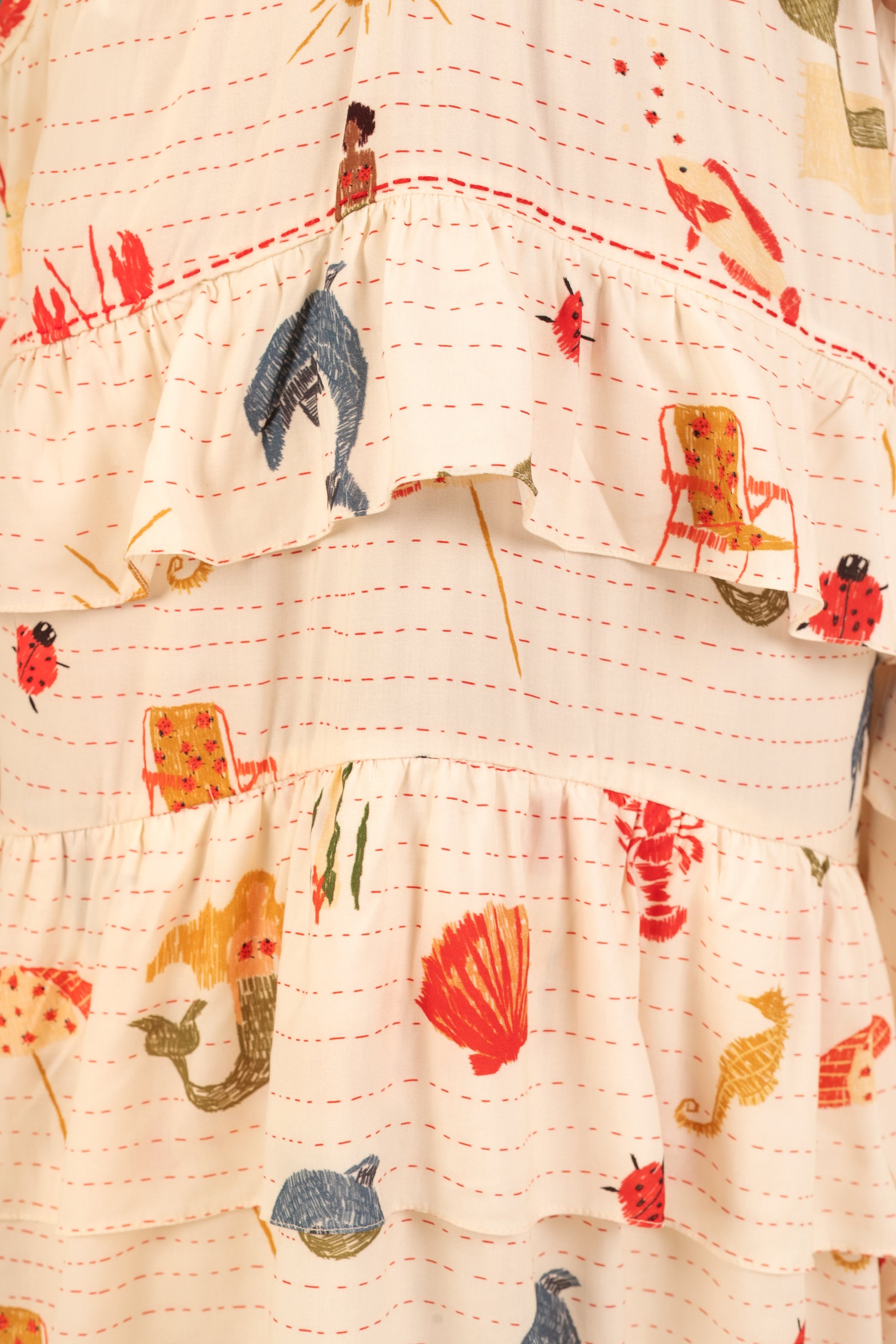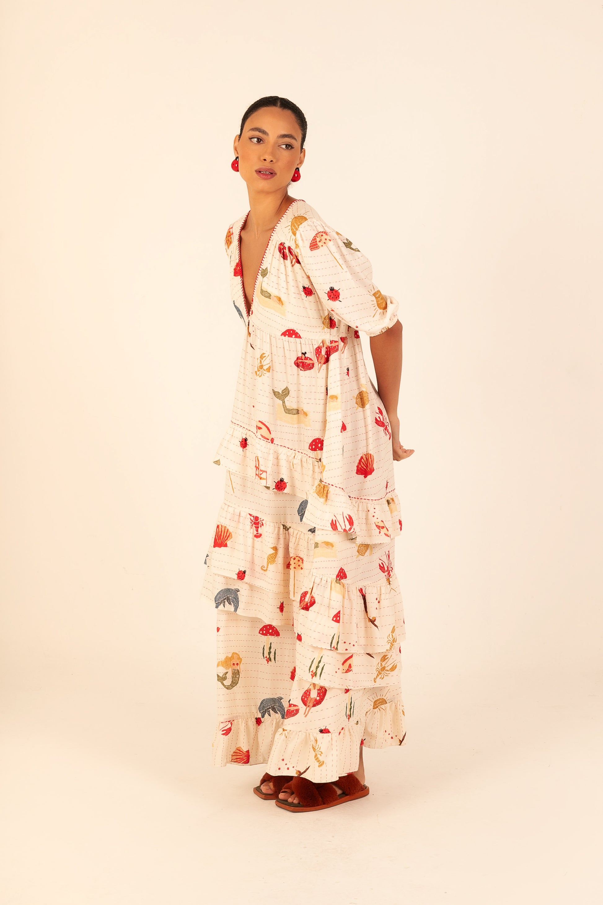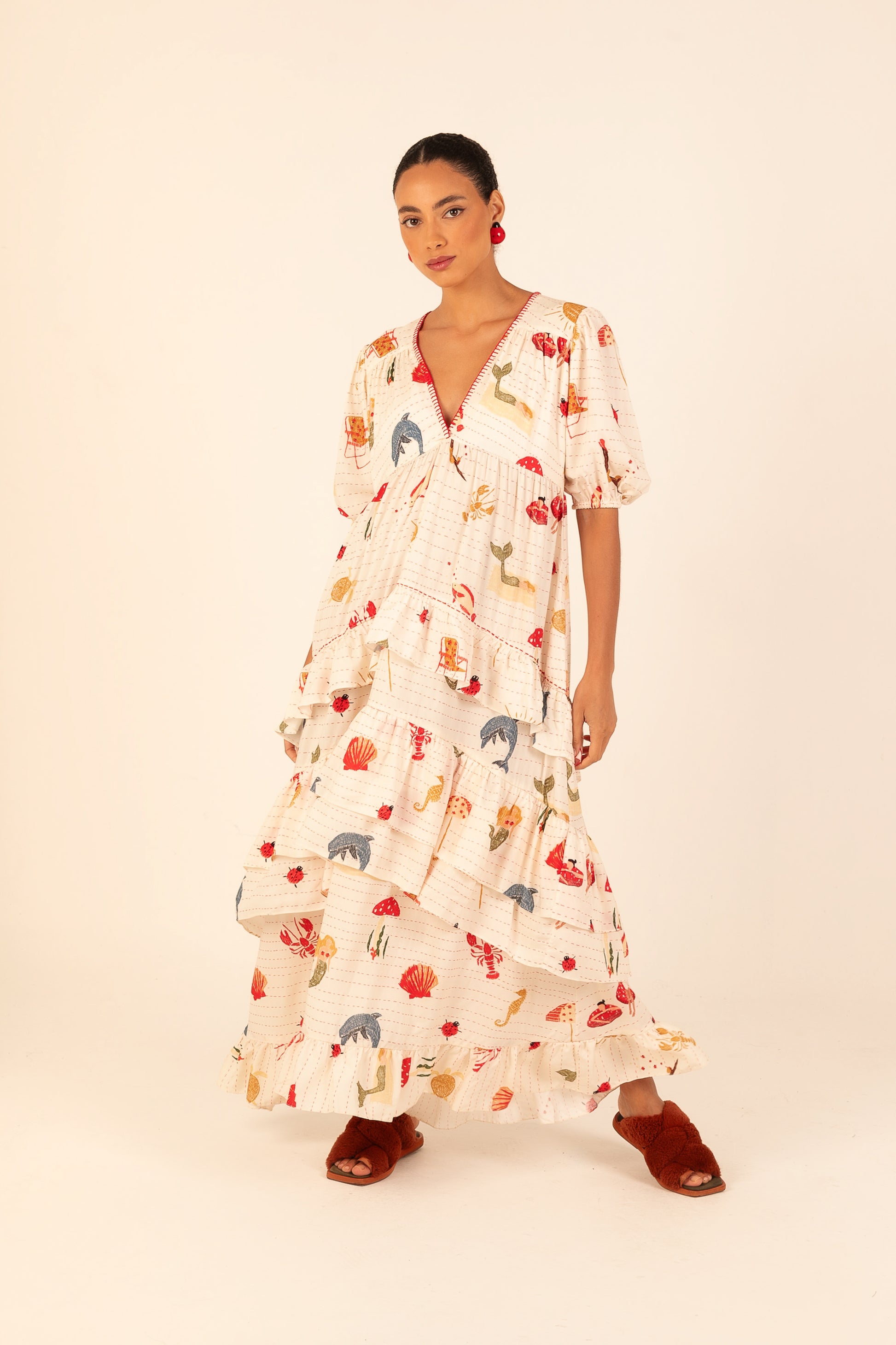 Com detalhes bordados à mão e a estampa exclusiva criada em colaboração com a artista Isabela Cury, o Vestido Afeto Sereias é um símbolo de sofisticação.