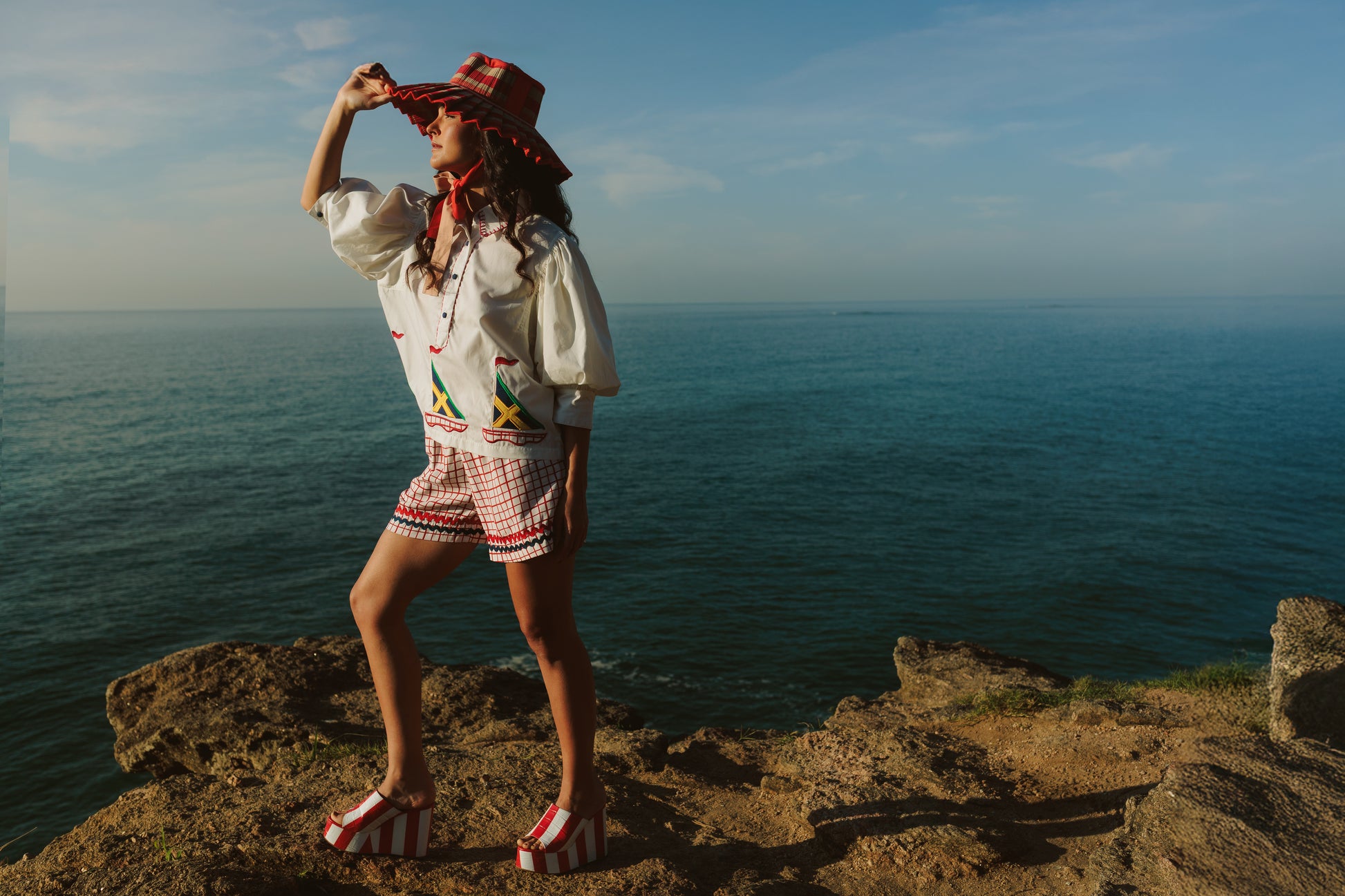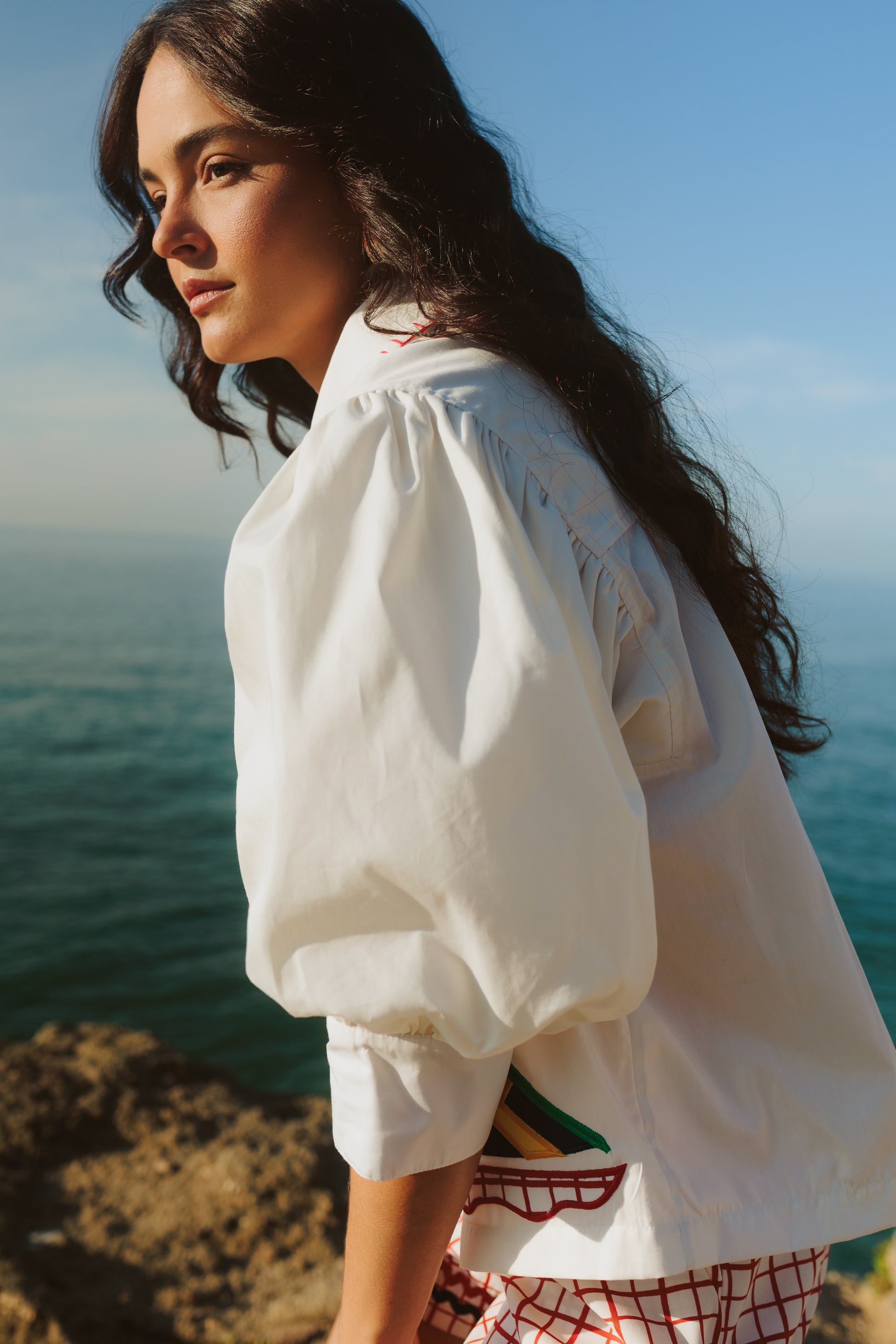 Com cava quadrada e mangas bufantes forradas, a Camisa Navegantes traz um visual marcante. A gola e toda a área do abotoamento recebem bordados feitos à mão, e os botões forrados reforçam o cuidado com a peça. Para completar, pequenos barcos são cuidadosamente bordados e construídos com aplicações de tecido, criando um efeito artesanal único.