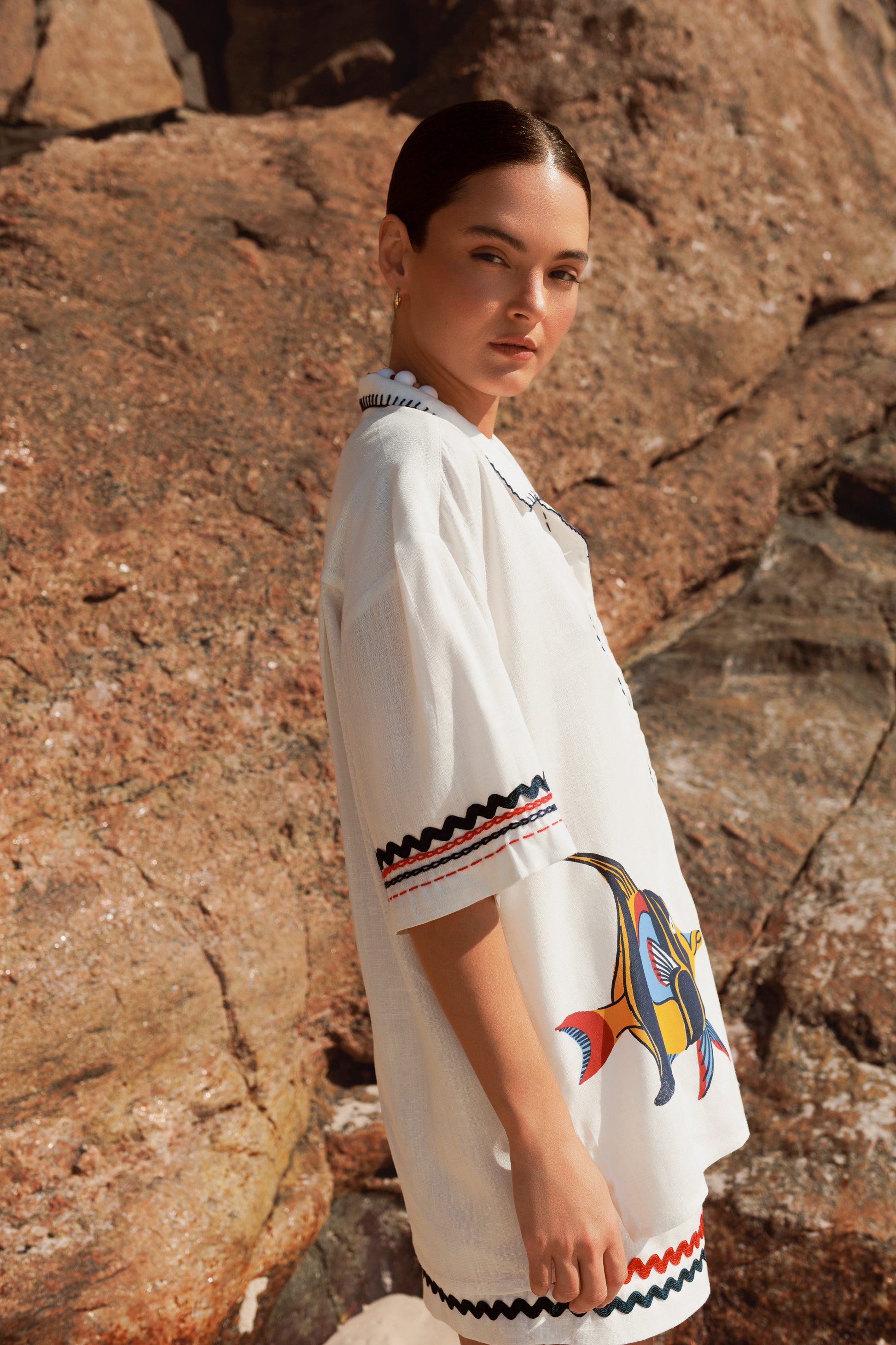 Unissex e com modelagem leve e confortável, a Camisa Noronha traz um toque sofisticado com sua gola estilo blazer, perfeita para composições descomplicadas e cheias de personalidade. Com bordados feitos totalmente à mão, a camisa também recebe aplicações de sianinha que destacam o cuidado da Mabô. O silk artesanal de peixes adiciona charme, criando uma conexão afetiva com o mar. Com botões frontais e acabamento minucioso, é uma camisa versátil, única e cheia de detalhes que fazem toda a diferença.